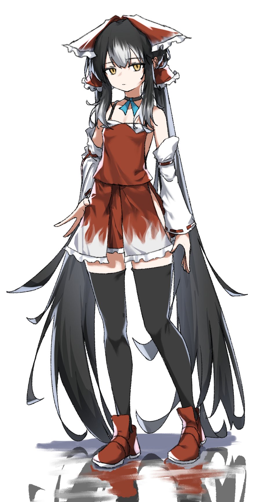 1girl adapted_costume alternate_hair_length alternate_hairstyle black_hair bow brown_eyes closed_mouth detached_sleeves full_body hair_bow hakurei_reimu highres long_hair looking_at_viewer red_bow red_footwear red_skirt reflection ribbon-trimmed_sleeves ribbon_trim simple_background skirt solo standing touhou traveler_hxy very_long_hair white_background