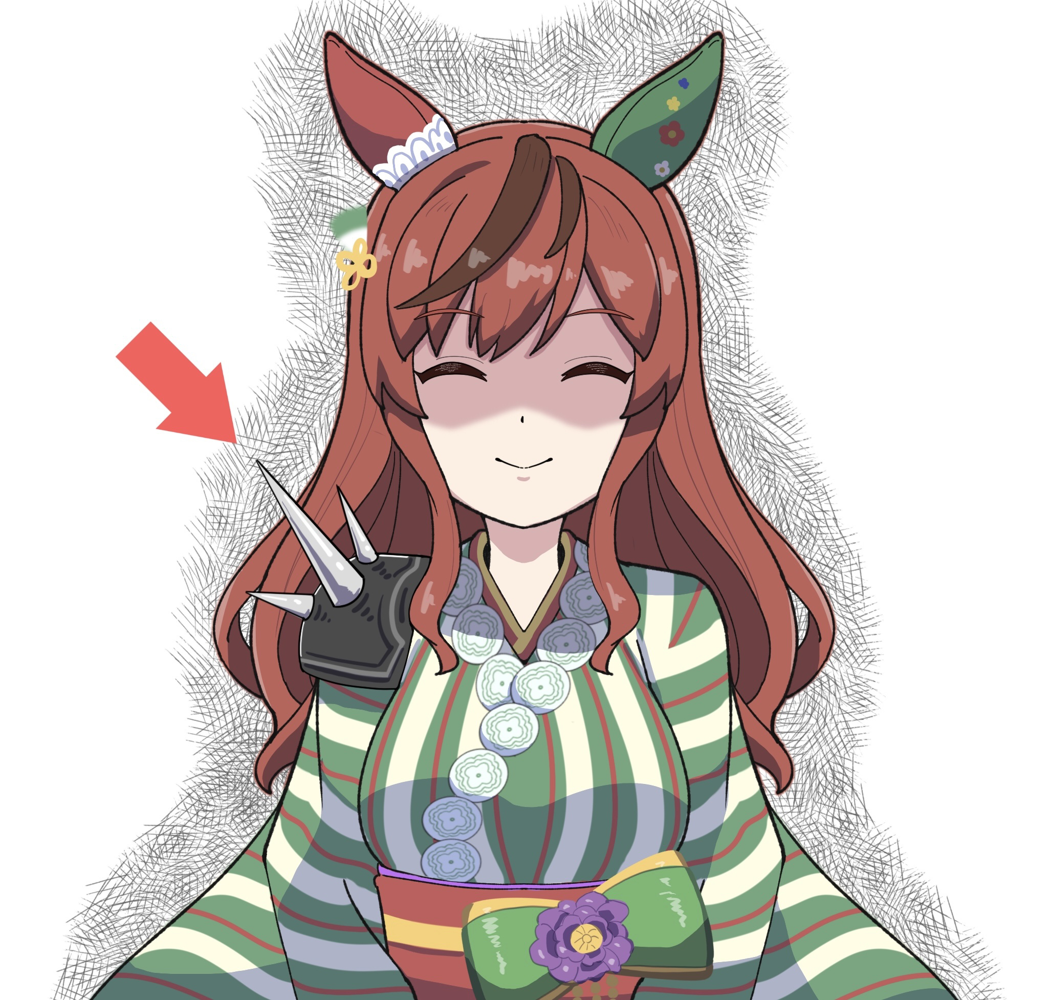 1girl alternate_costume alternate_hairstyle animal_ears arrow_(symbol) breasts brown_hair closed_eyes closed_mouth commentary_request ear_covers false_smile highres horse_ears horse_girl hu-min_(okok6341) japanese_clothes kimono long_hair looking_at_viewer medium_breasts nice_nature_(converging_wishes)_(umamusume) nice_nature_(negaino_kasane)_(umamusume) nice_nature_(umamusume) simple_background smile solo umamusume white_background