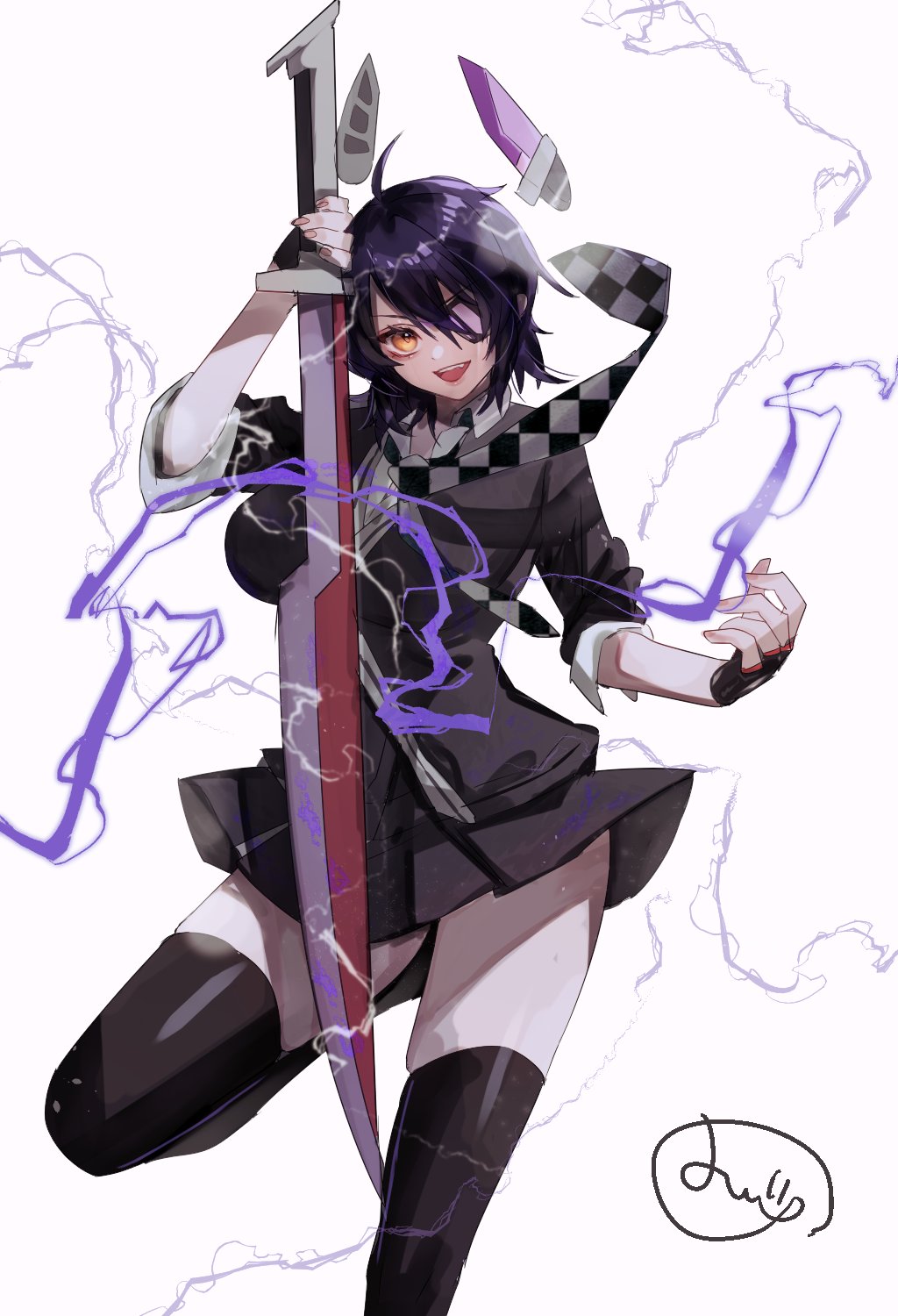 1girl black_cardigan black_gloves black_hair black_skirt black_thighhighs cardigan checkered_necktie electricity eyepatch feet_out_of_frame fingerless_gloves floating_headgear gloves headgear highres kantai_collection mizoredama1 necktie pleated_skirt school_uniform short_hair signature simple_background skirt solo standing standing_on_one_leg sword tenryuu_(kancolle) thighhighs weapon white_background white_eyes yellow_eyes
