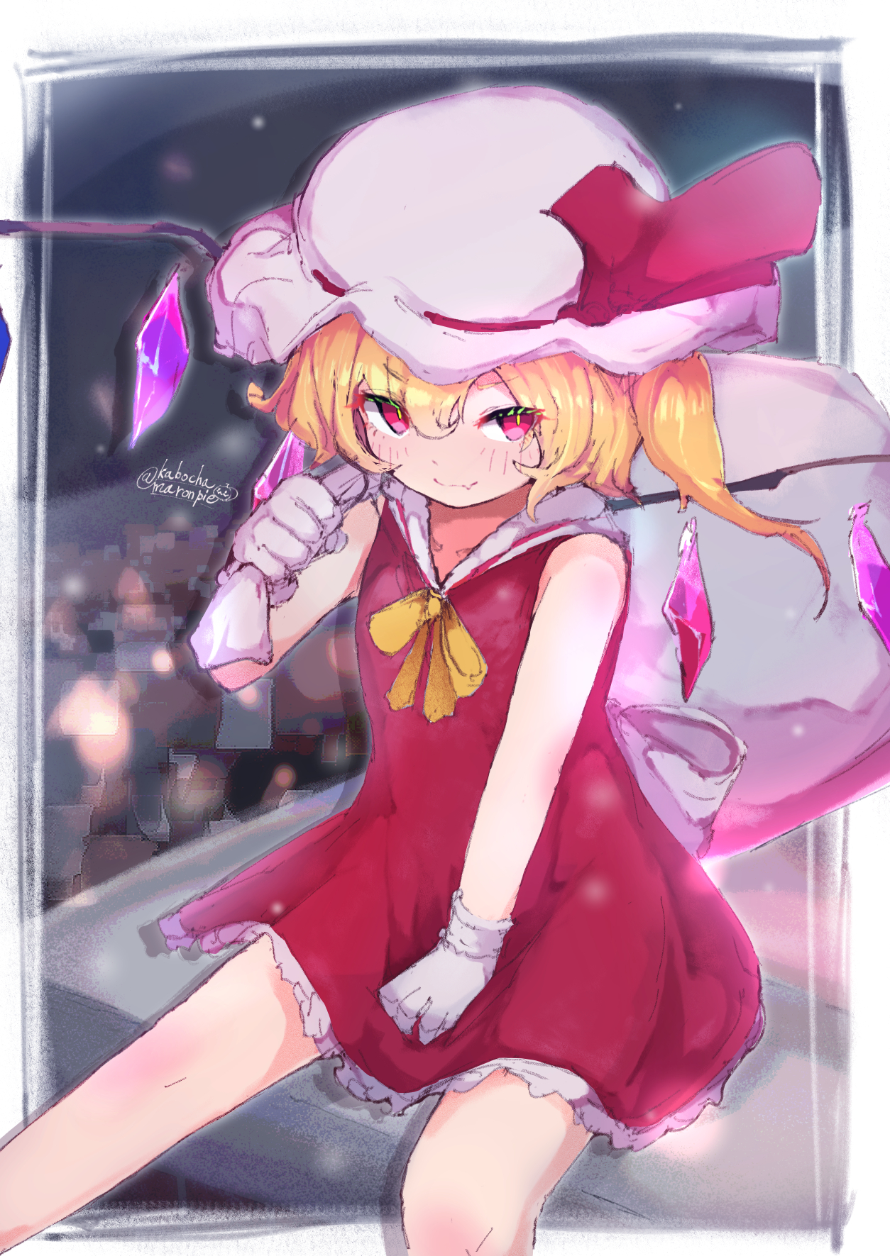 1girl ascot bag dress flandre_scarlet gloves hat highres kabochamaronpie looking_at_viewer mob_cap outdoors red_dress red_eyes short_hair side_ponytail sitting smile snow solo touhou white_gloves yellow_ascot