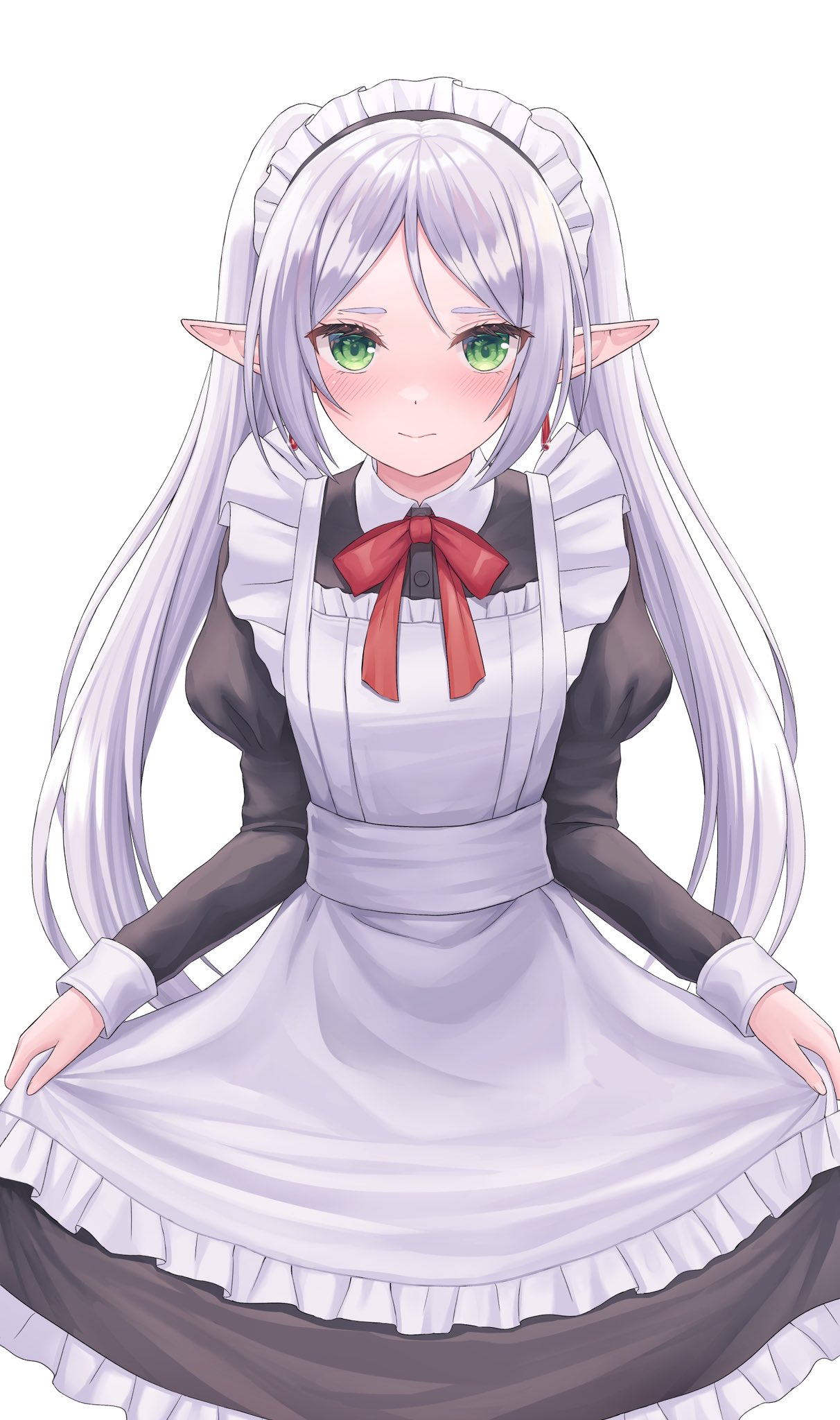 1girl alternate_costume apron black_dress closed_mouth collar collared_dress dress elf enmaided frieren frilled_dress frills green_eyes highres light_blush long_hair long_sleeves looking_at_viewer maid neck_ribbon pointy_ears red_ribbon ribbon seungju_lee simple_background smile solo sousou_no_frieren standing straight-on thick_eyebrows twintails white_apron white_background white_collar white_hair