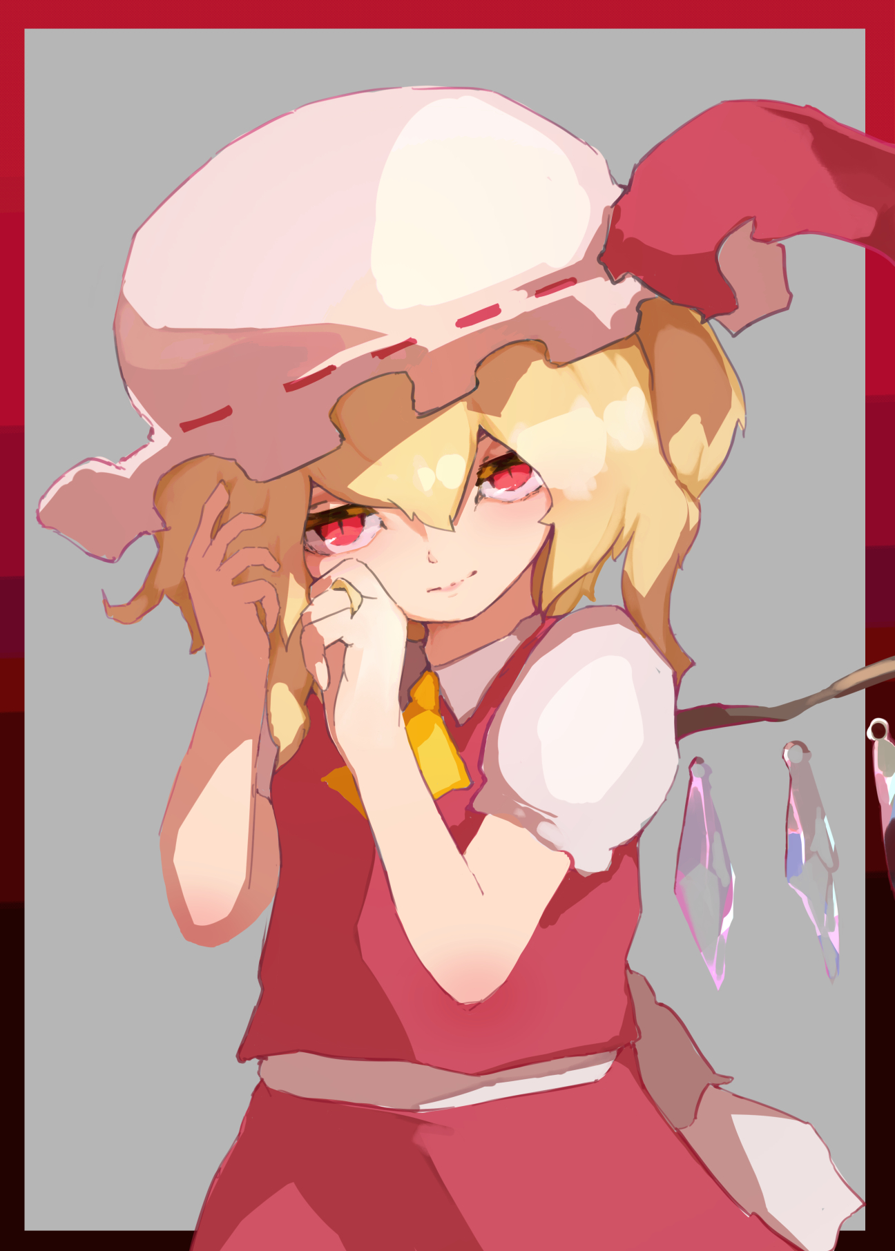 1girl ascot blonde_hair cowboy_shot crystal flandre_scarlet grey_background hand_up hat head_tilt highres kabochamaronpie mob_cap red_eyes short_hair simple_background solo touhou yellow_ascot