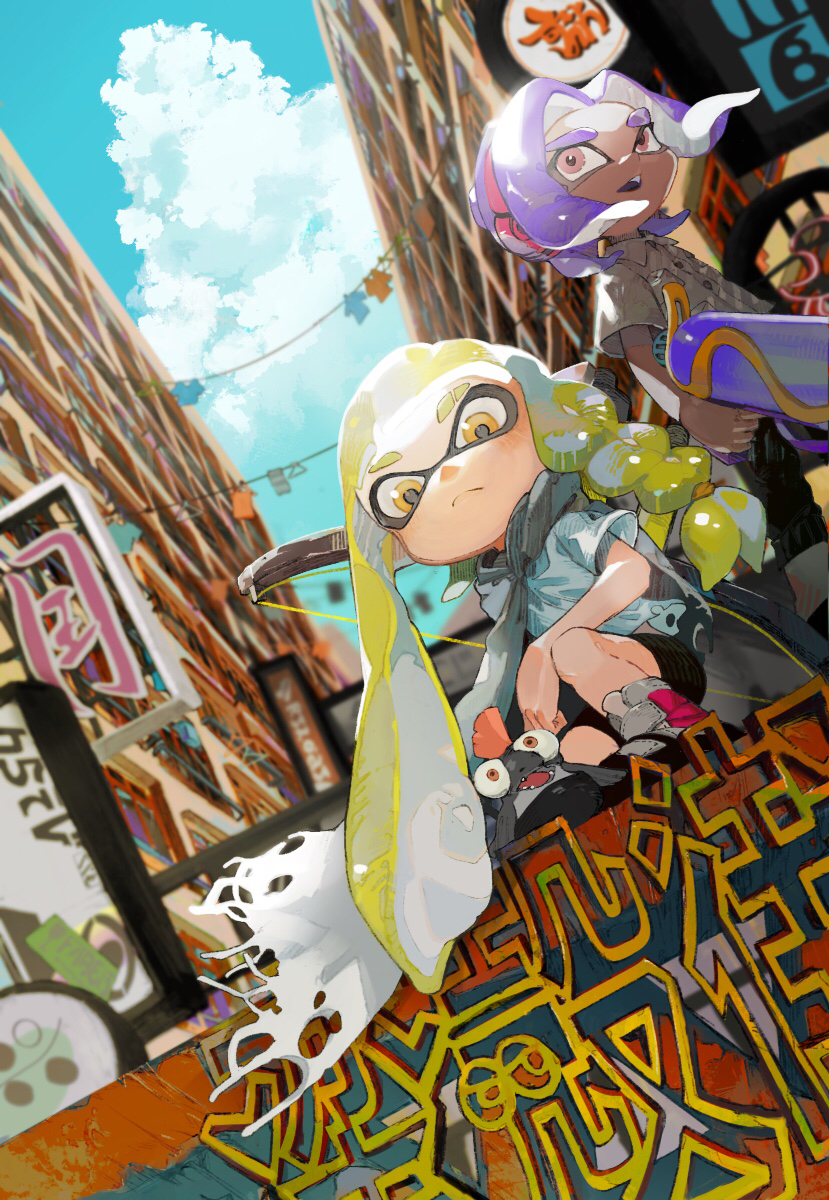 1boy 1girl black_shorts blonde_hair blue_sky brown_eyes city cloud commentary_request dark-skinned_male dark_skin grey_scarf gun highres holding holding_gun holding_weapon inkling inkling_(language) inkling_girl inkling_player_character long_hair nintendo octoling octoling_boy octoling_player_character open_mouth outdoors panchicchi_(pixiv_101958735) pointy_ears purple_hair scarf shirt shorts sky splatoon_(series) splatoon_3 splattershot_(splatoon) squatting standing tentacle_hair tri-stringer_(splatoon) weapon white_shirt