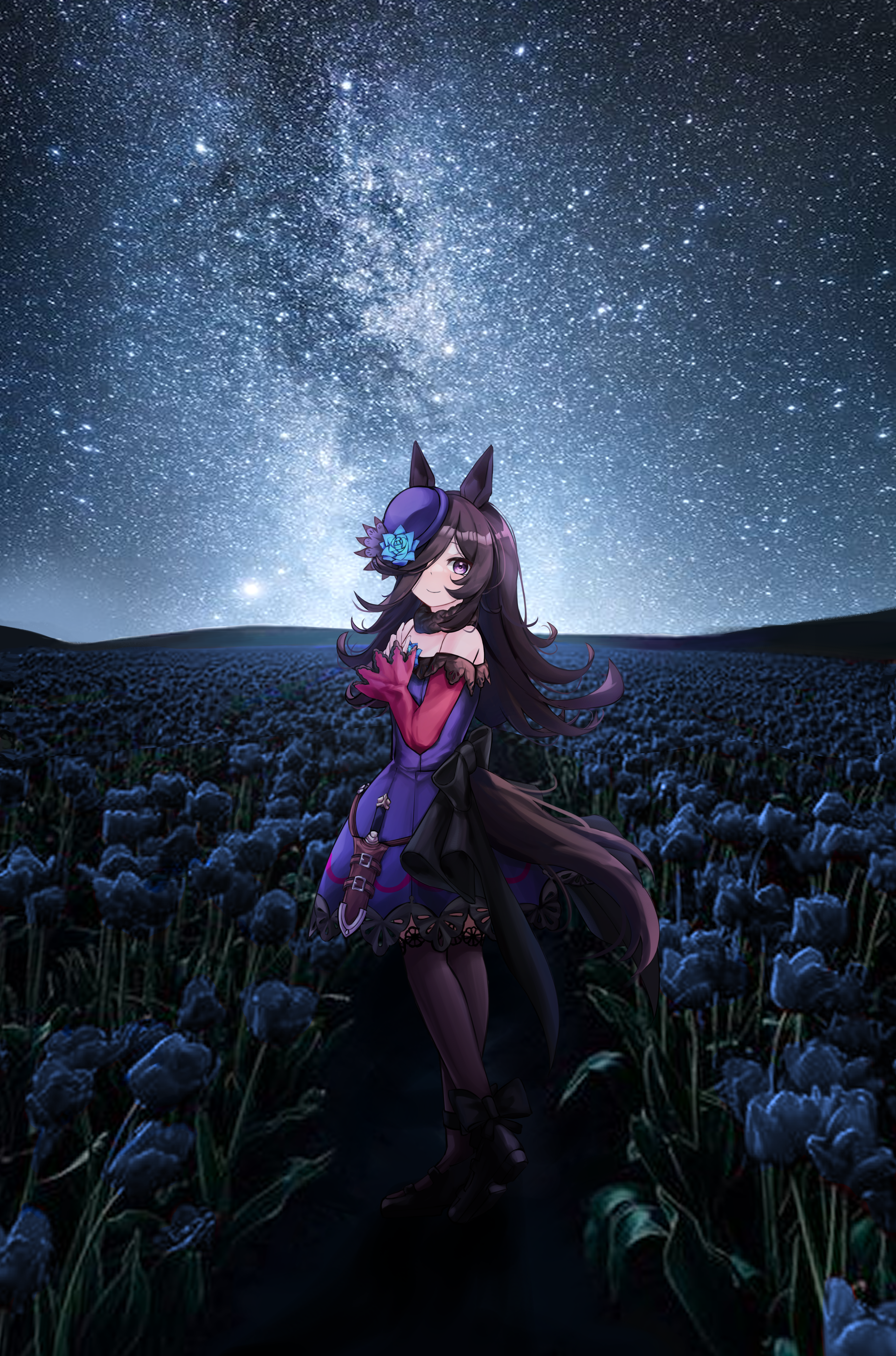 1girl absurdres animal_ears back_bow bare_shoulders black_bow black_pantyhose black_shoes blue_flower blue_rose blush bow brown_hair commentary_request dagger dress field flower flower_field full_body hair_over_one_eye highres horse_ears horse_girl horse_tail knife long_hair looking_at_viewer night pantyhose purple_dress purple_eyes purple_headwear rice_shower_(umamusume) rose sheath sheathed shoes sky smile solo star_(sky) starry_sky tail ukinon umamusume weapon