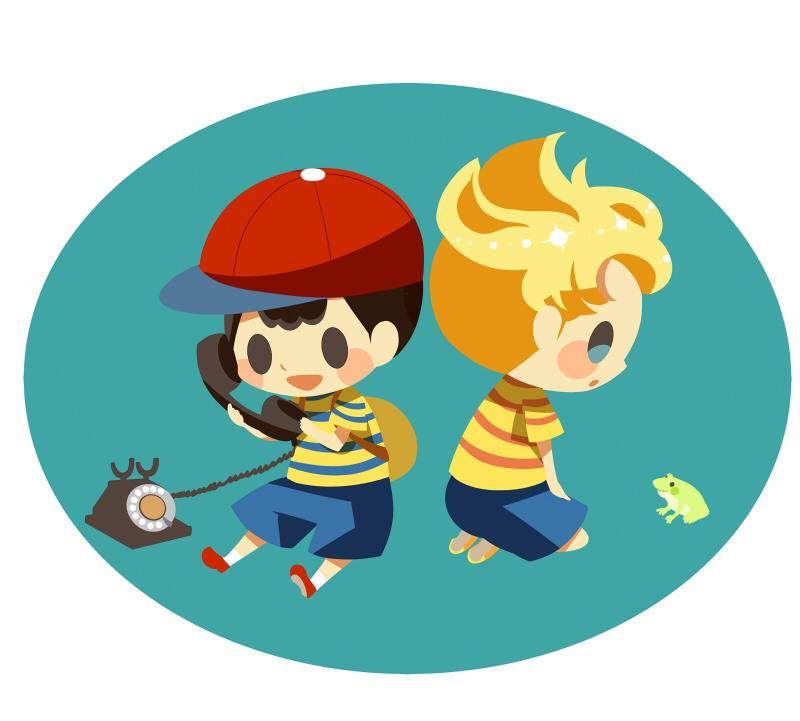 animal antique_phone backpack bag baseball_cap black_hair blonde_hair blue_shorts blush_stickers brown_bag frog gameplay_mechanics hat hitofutarai kneeling lucas_(mother_3) mother_(series) mother_2 mother_3 ness's_father ness_(mother_2) nintendo orange_shoes phone red_footwear red_headwear rotary_phone round_border shirt shoes shorts sitting socks solid_oval_eyes striped_clothes striped_shirt talking_on_phone white_socks