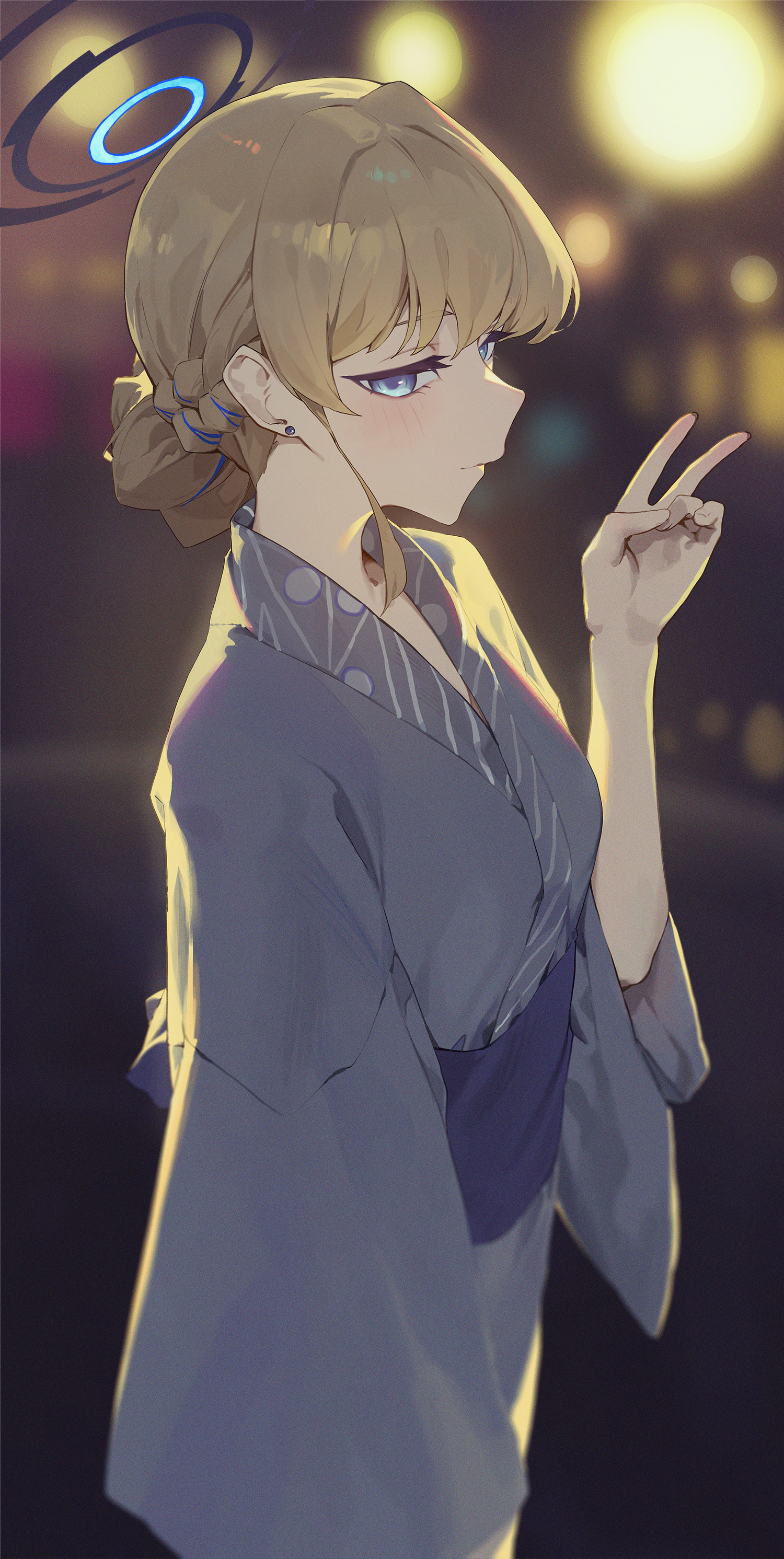 1girl absurdres blonde_hair blue_archive blue_eyes blue_hair blue_halo blush braid closed_mouth from_side grey_kimono halo highres japanese_clothes kimono kji_(rozo) long_sleeves multicolored_hair obi profile sash short_hair solo streaked_hair toki_(blue_archive) v wide_sleeves