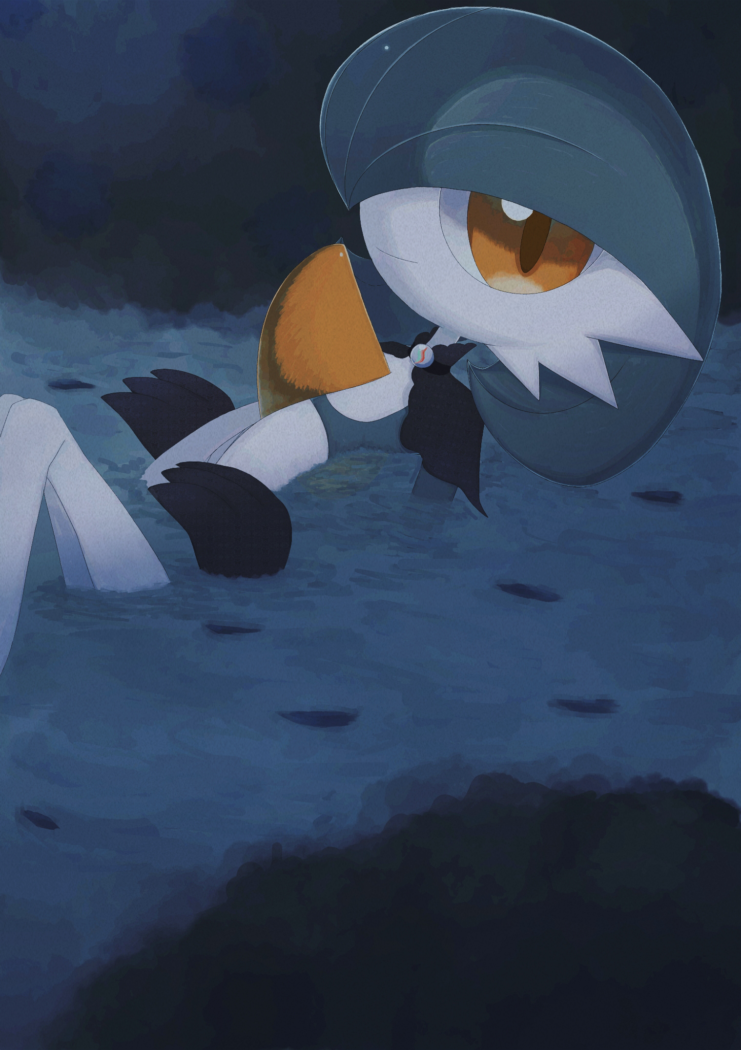1girl alternate_color black_capelet black_gloves blue_hair blue_skin bob_cut capelet closed_mouth clothed_pokemon colored_skin female_focus flat_chest gardevoir gen_3_pokemon gloves hair_over_one_eye happy highres knees_up leaning_back legs_together looking_at_viewer mega_stone multicolored_skin night nintendo one_eye_covered orange_eyes outdoors partially_submerged petals petals_on_liquid pokemon pokemon_(creature) shicha_(yagu) shiny_pokemon short_hair smile solo two-tone_skin water white_skin