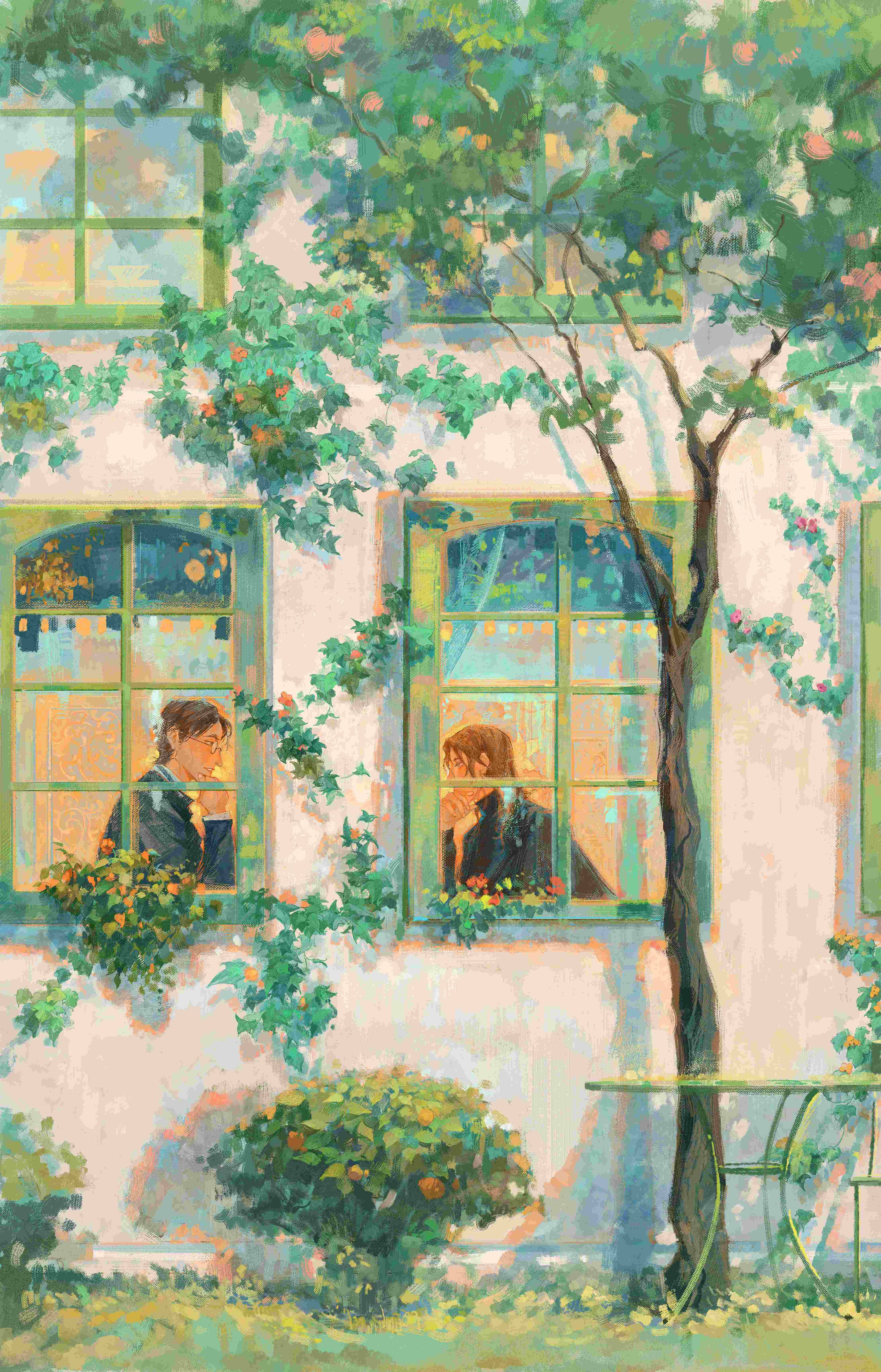 2boys absurdres alexei_karamazov black_shirt black_suit brothers brown_hair building day formal_clothes glasses hand_on_own_chin highres ivan_karamazov leaf light_brown_hair long_hair looking_at_another multiple_boys shirt short_hair siblings suit sutekooooo table talking the_karamazov_brothers tree window