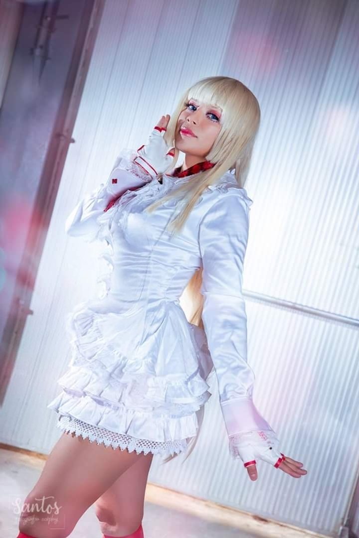1girl blonde_hair brazilian_(nationality) breasts cosplay emilie_de_rochefort emilie_de_rochefort_(cosplay) fingerless_gloves gloves large_breasts long_hair long_sleeves looking_at_viewer nooneenoni photo_(medium) real_life skirt tekken thighs