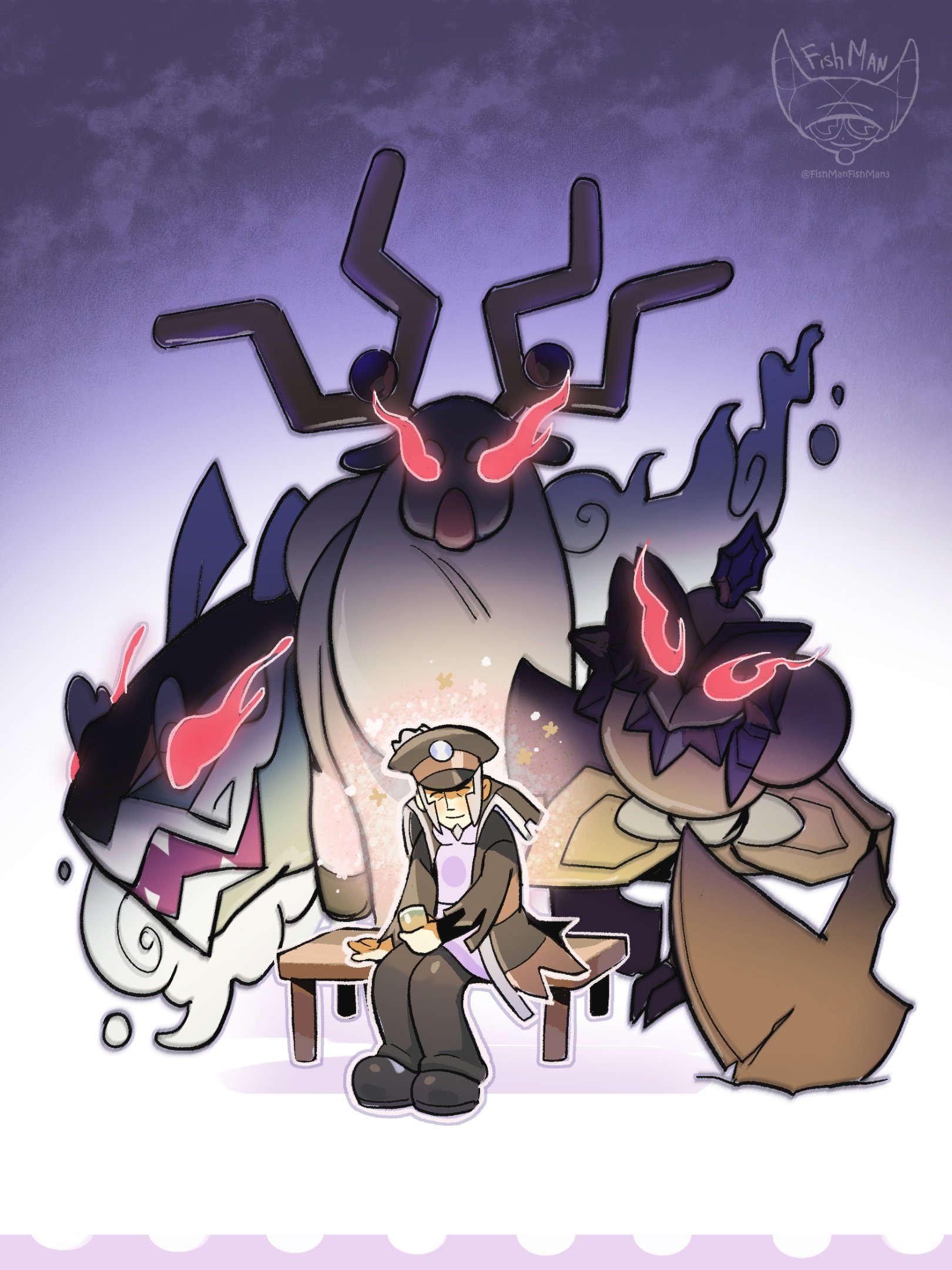 1boy antlers artist_name basculegion basculegion_(female) commentary deer english_commentary fish fishmanfishman3 glowing glowing_eyes gradient_background green_background highres horns ingo_(pokemon) kleavor nintendo on_bench open_mouth pokemon pokemon_(creature) pokemon_legends:_arceus red_eyes sharp_teeth sitting teeth twitter_username wyrdeer