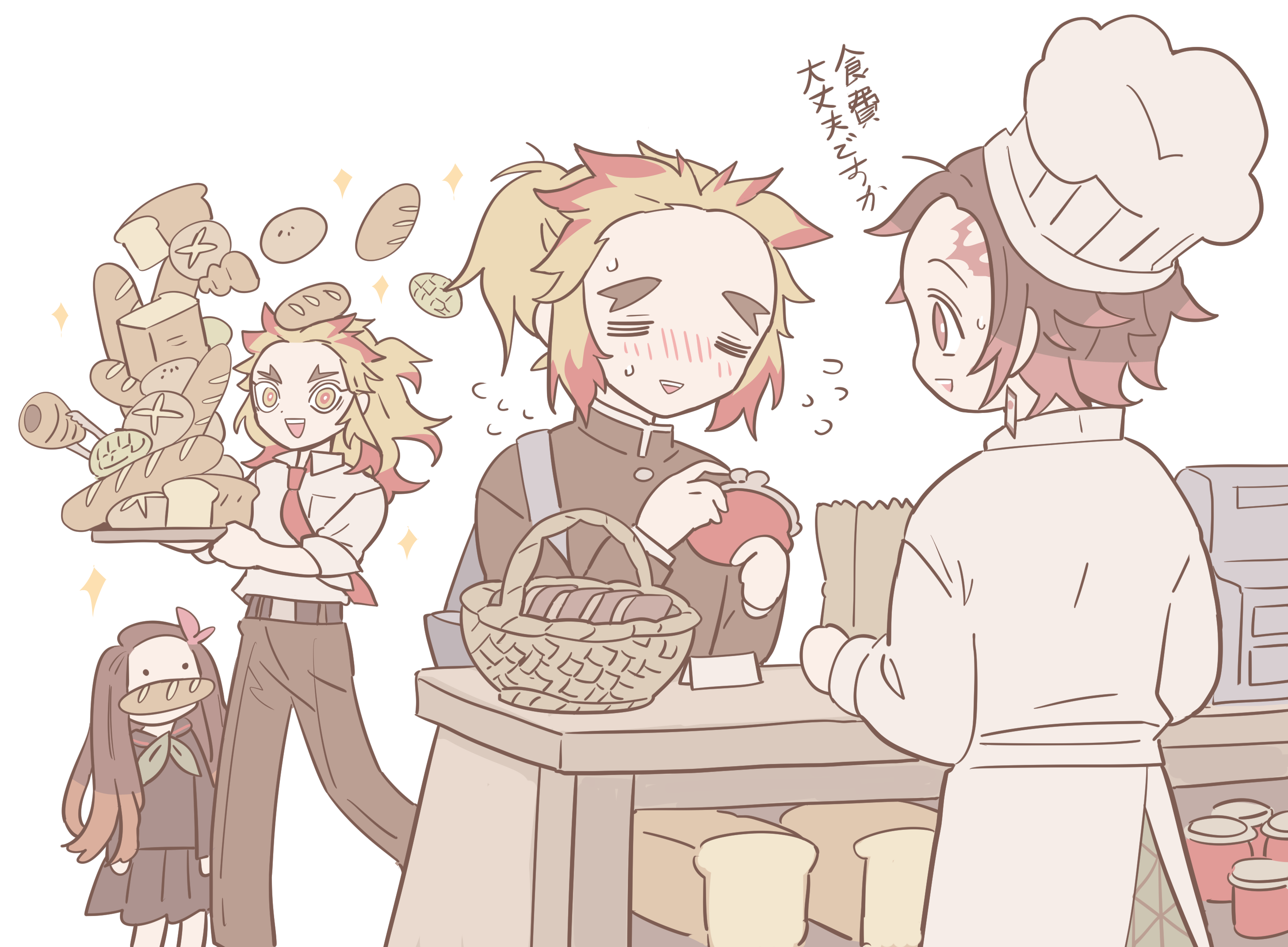1girl 3boys =_= alternate_costume bag baguette bakery basket black_hair black_serafuku bread brothers chef_hat commentary_request counter earrings flying_sweatdrops food hat highres holding holding_plate holding_wallet jewelry kamado_nezuko kamado_tanjirou kimetsu_no_yaiba long_hair long_sleeves looking_at_another meremero mouth_hold multiple_boys necktie open_mouth pants paper_bag plate red_eyes red_hair red_necktie rengoku_kyoujurou rengoku_senjurou scar scar_on_face scar_on_forehead school_uniform serafuku shirt shop short_hair siblings smile sparkle standing sweatdrop too_much_food translation_request wallet white_shirt