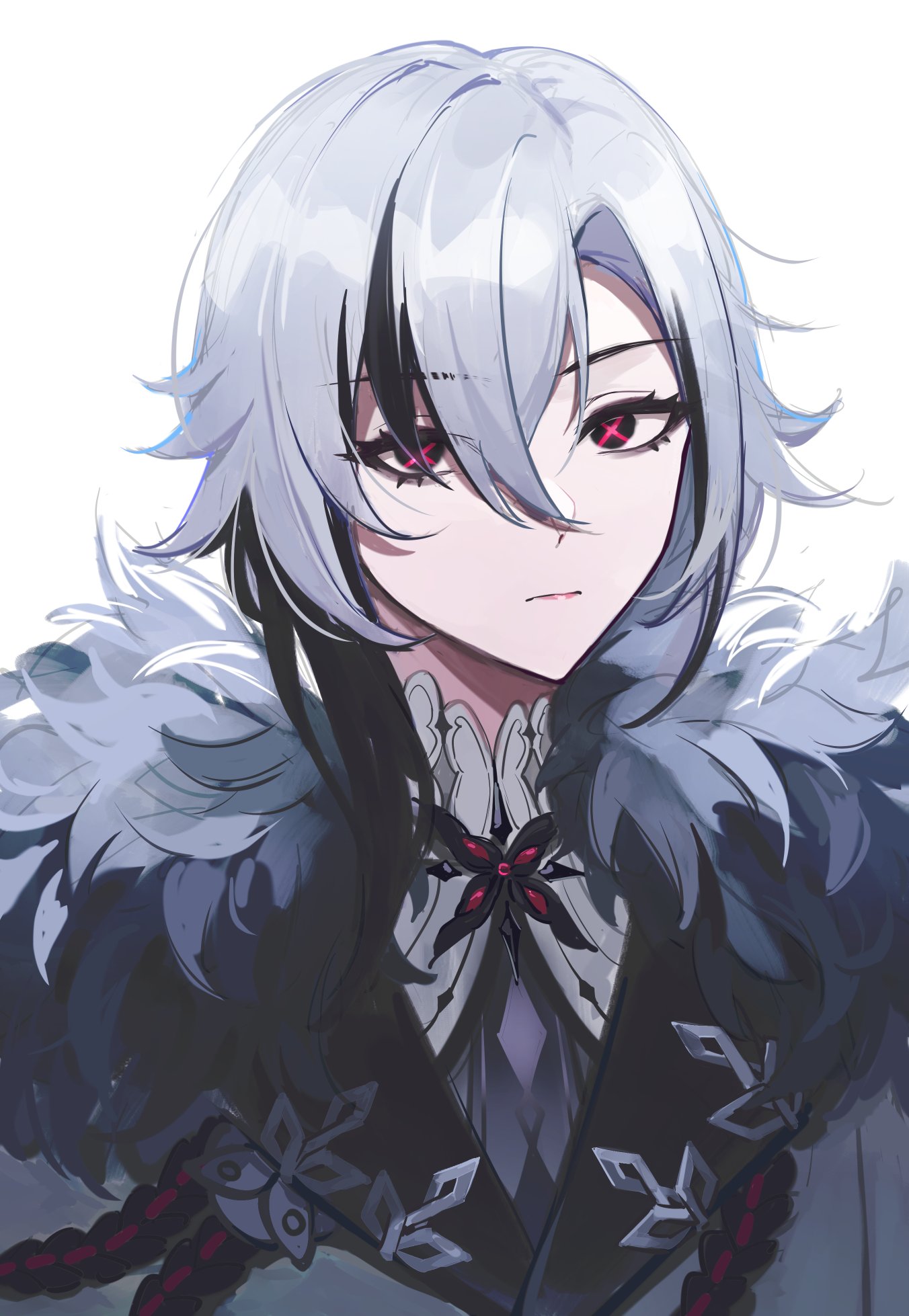 1girl arlecchino_(genshin_impact) black_eyes black_hair closed_mouth coat fatui_coat fur-trimmed_coat fur_trim genshin_impact hair_between_eyes highres looking_at_viewer medium_hair multicolored_hair portrait simple_background solo streaked_hair symbol-shaped_pupils two-tone_hair white_background white_coat white_hair x-shaped_pupils yamiiv