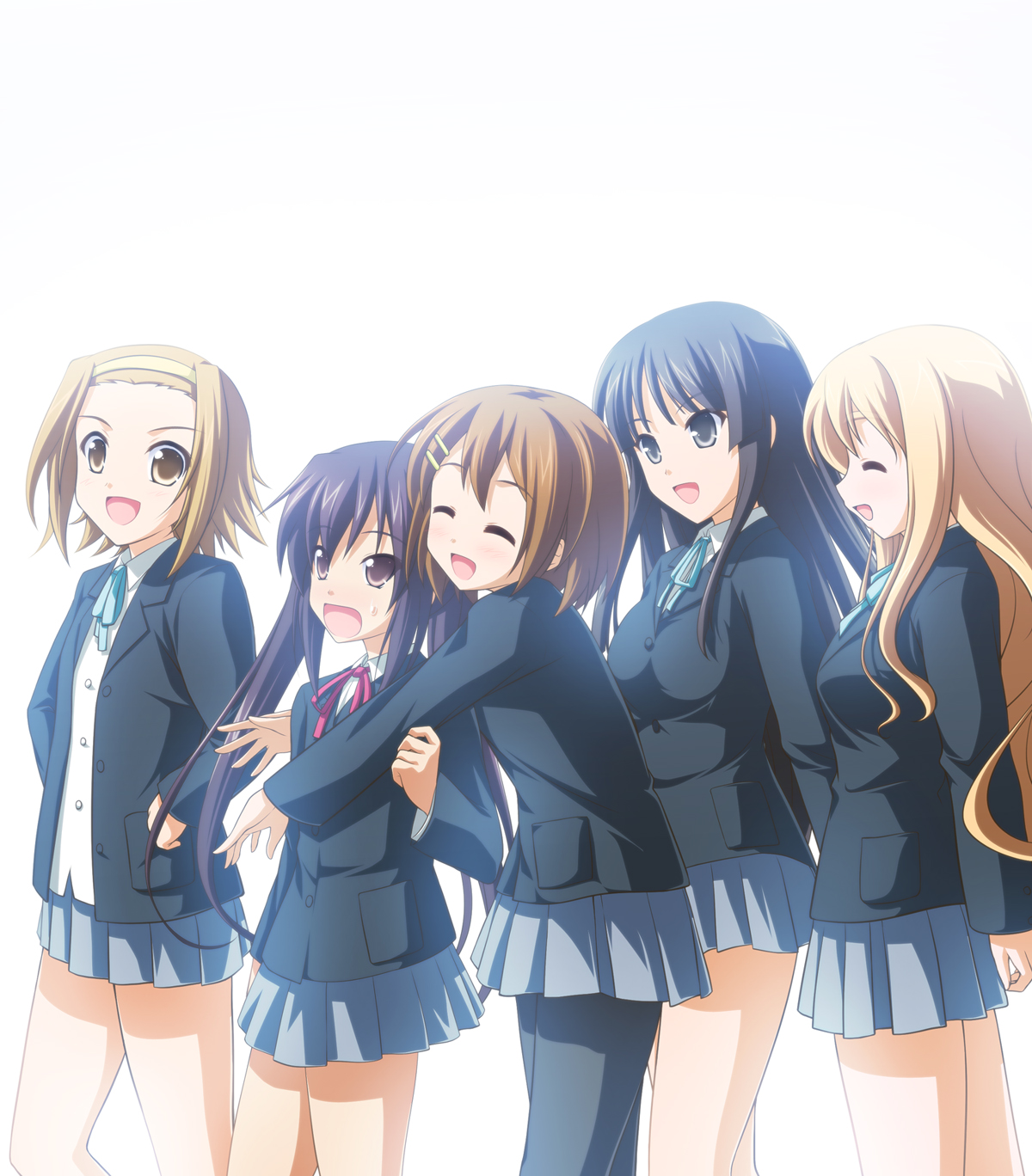 5girls akiyama_mio black_eyes black_hair blonde_hair brown_eyes brown_hair closed_eyes highres hirasawa_yui ho-kago_tea_time hug k-on! kotobuki_tsumugi long_hair multiple_girls nakano_azusa open_mouth pantyhose school_uniform short_hair tainaka_ritsu tsuda_akira
