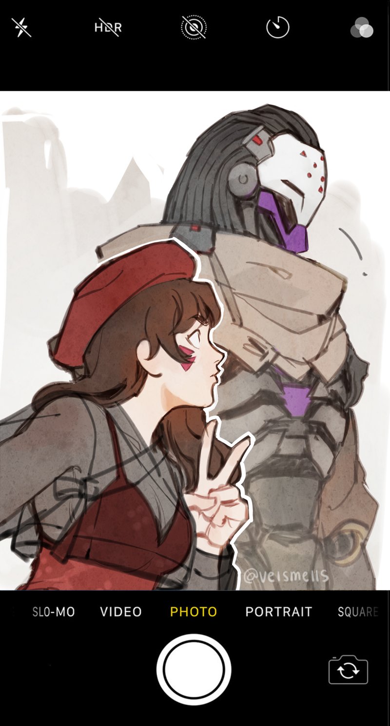 ! 1boy 1girl beret black_hair casual commentary crop_top d.va_(overwatch) dress english_commentary facial_mark fashion hat height_difference highres long_hair looking_at_another overwatch overwatch_2 ramattra_(overwatch) red_dress red_headwear see-through_clothes see-through_shirt selfie surprised turning_head variant_set velinxi whisker_markings