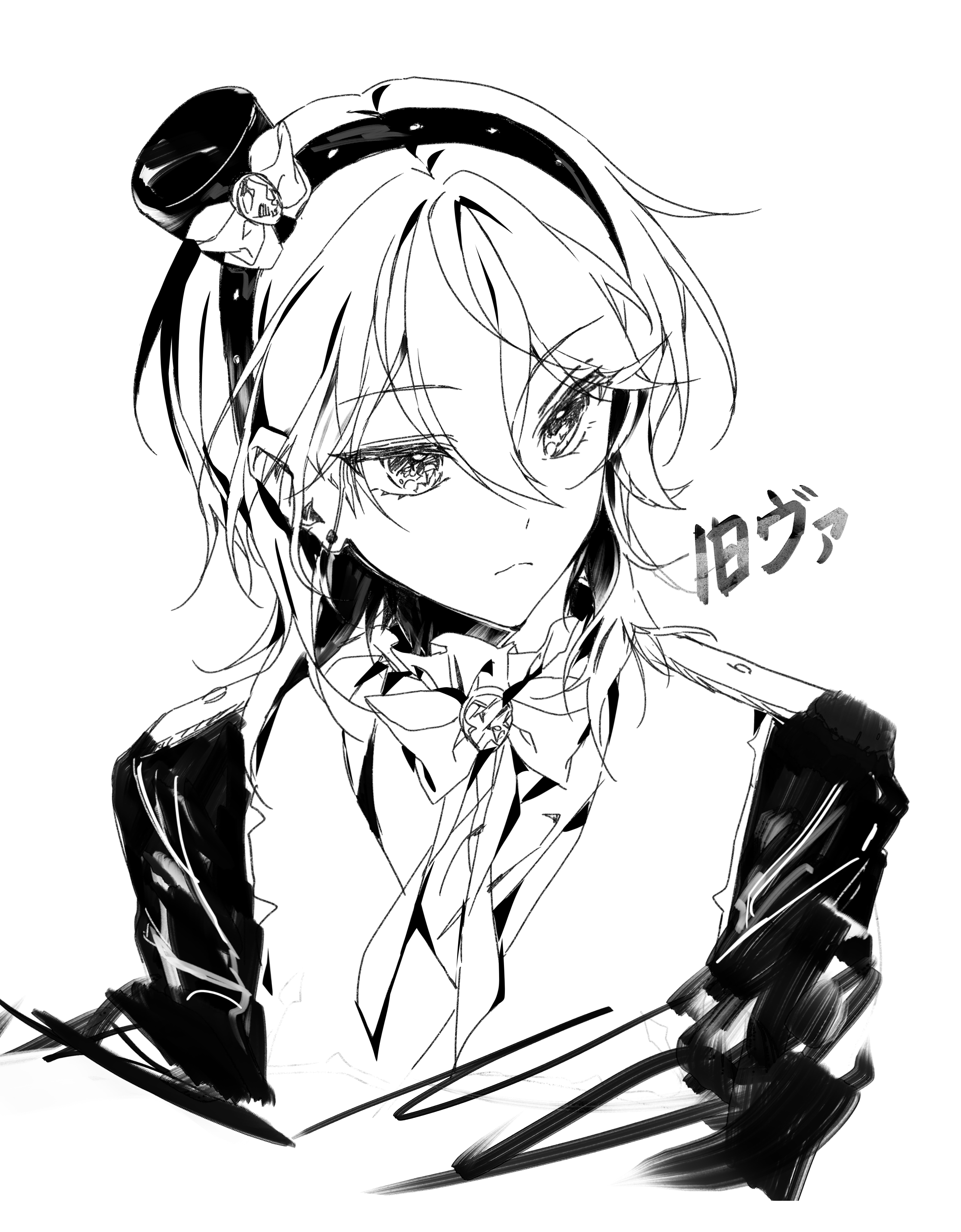 1boy absurdres androgynous bow character_name closed_mouth ensemble_stars! expressionless grey_background greyscale highres kes_0210 long_sleeves male_focus monochrome nito_nazuna official_alternate_costume reminiscence_marionette_(ensemble_stars!) short_hair_with_long_locks simple_background solo vest