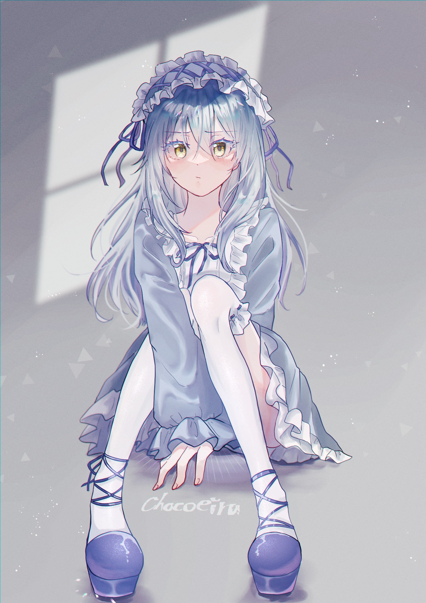 1other alternate_costume androgynous ankle_ribbon between_legs blue_dress blue_footwear blue_hair blue_ribbon chocoeiru closed_mouth dress floating_hair frilled_dress frills full_body hair_between_eyes hand_between_legs headdress highres leg_ribbon long_hair looking_at_viewer maid_headdress ribbon ribbon-trimmed_legwear ribbon_trim rimuru_tempest short_dress sitting solo tensei_shitara_slime_datta_ken thighhighs white_thighhighs yellow_eyes zettai_ryouiki