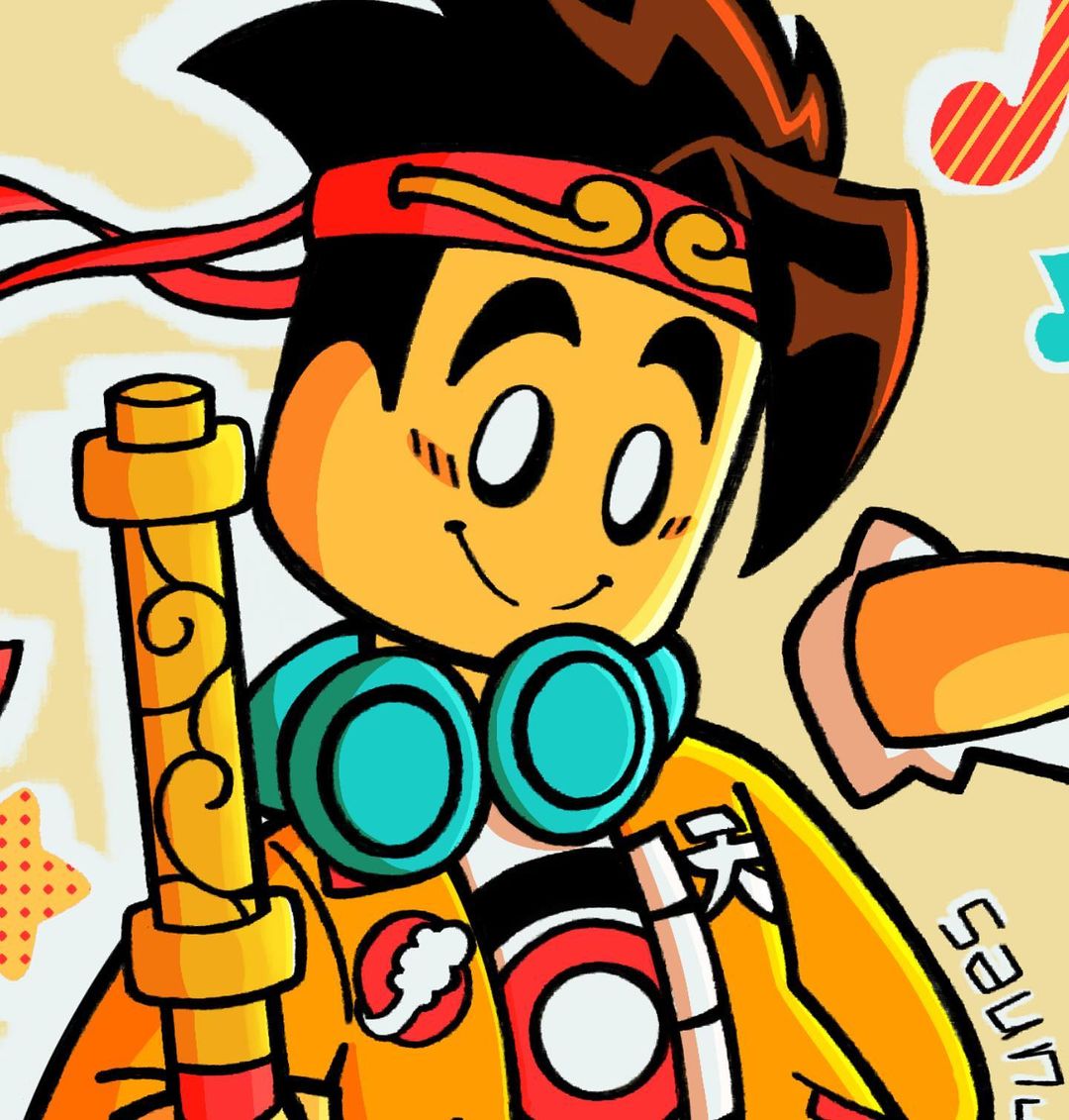 1boy bandana blush chinese_text colored_skin eighth_note headphones lego m4carunes male_focus mk_(monkie_kid) lego_monkie_kid musical_note parent:9477206 spiked_hair staff