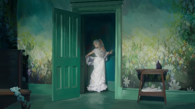 1girl commentary_request door dress elf flower frieren green_theme indoors long_dress mural off_shoulder open_door pointy_ears shawl solo sousou_no_frieren standing table twintails white_dress white_hair wide_shot yao_liao_wang