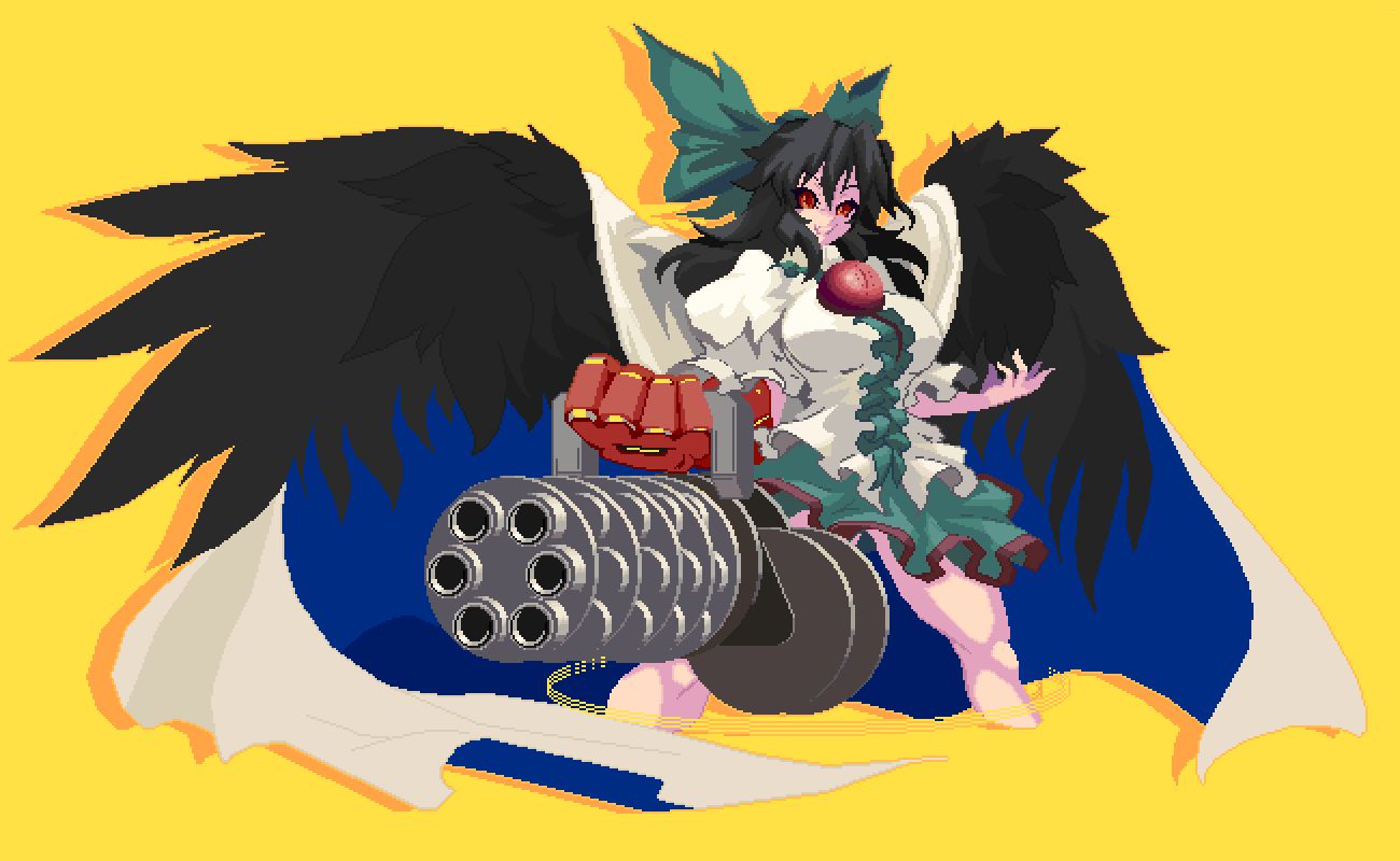 1girl bird_wings black_hair black_wings bow breasts cape gatling_gun green_bow green_skirt hair_bow large_breasts long_hair looking_at_viewer mmmmatimmmmati pixel_art red_eyes reiuji_utsuho shirt simple_background skirt solo third_eye touhou white_cape white_shirt wings yellow_background