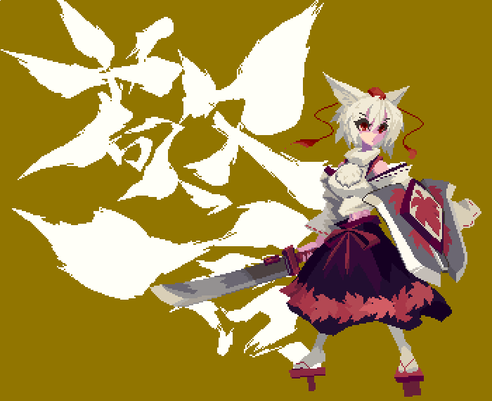 1girl animal_ears black_skirt commentary detached_sleeves full_body hat holding holding_shield holding_sword holding_weapon inubashiri_momiji leaf leaf_print maple_leaf maple_leaf_print mmmmatimmmmati pixel_art pom_pom_(clothes) red_hat ribbon-trimmed_sleeves ribbon_trim shield shirt short_hair skirt solo sword tokin_hat touhou weapon white_hair white_shirt wolf_ears wolf_girl yellow_background