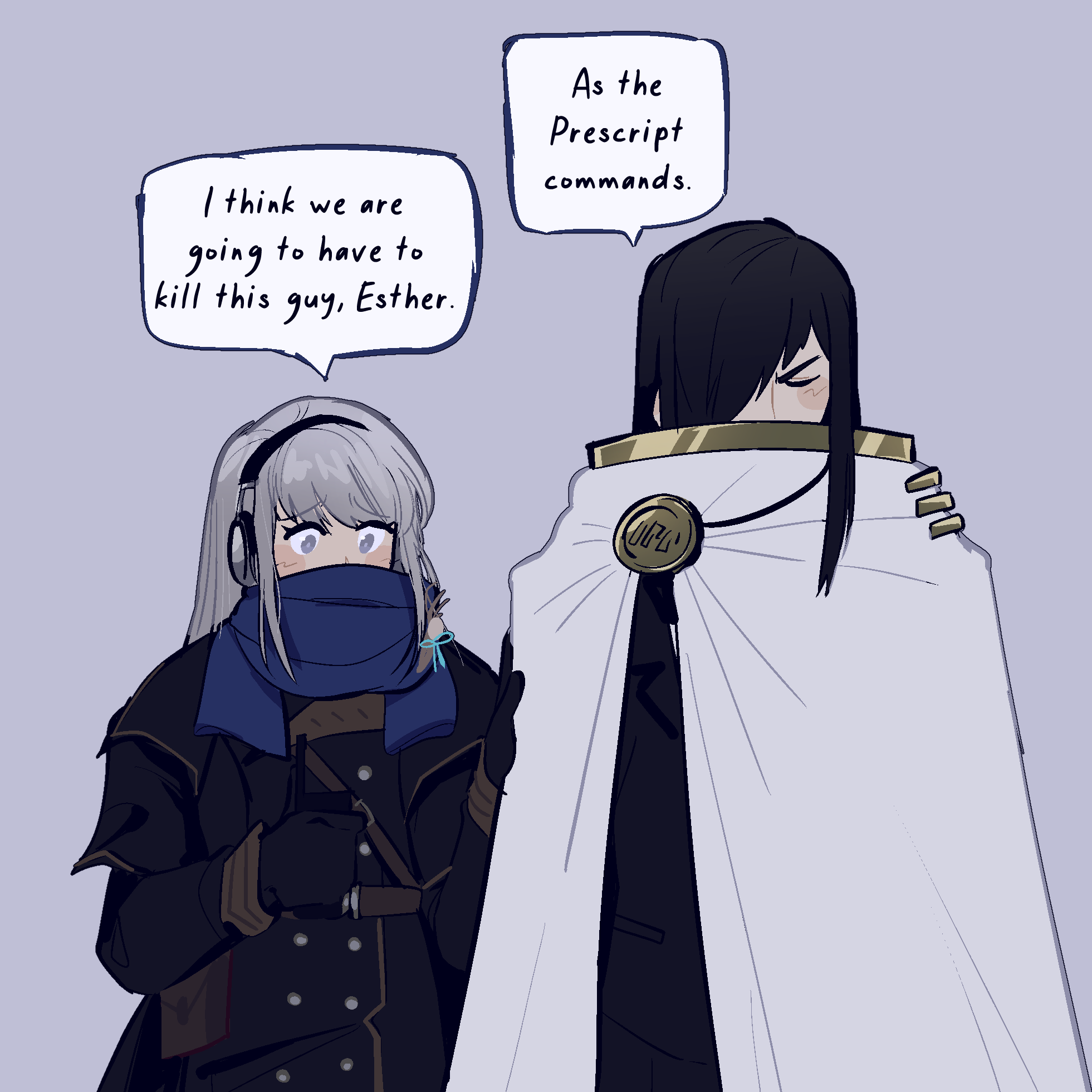 1boy 1girl bkornblume black_coat black_gloves black_hair blue_scarf buttons cloak closed_eyes coat covered_mouth crossover english_text esther_(project_moon) ghost_locket gloves grey_background grey_eyes grey_hair hair_over_one_eye headphones highres holding holding_walkie-talkie i_think_we're_gonna_have_to_kill_this_guy_steven_(meme) library_of_ruina long_hair meme project_moon reverse:1999 scarf speech_bubble walkie-talkie white_hair