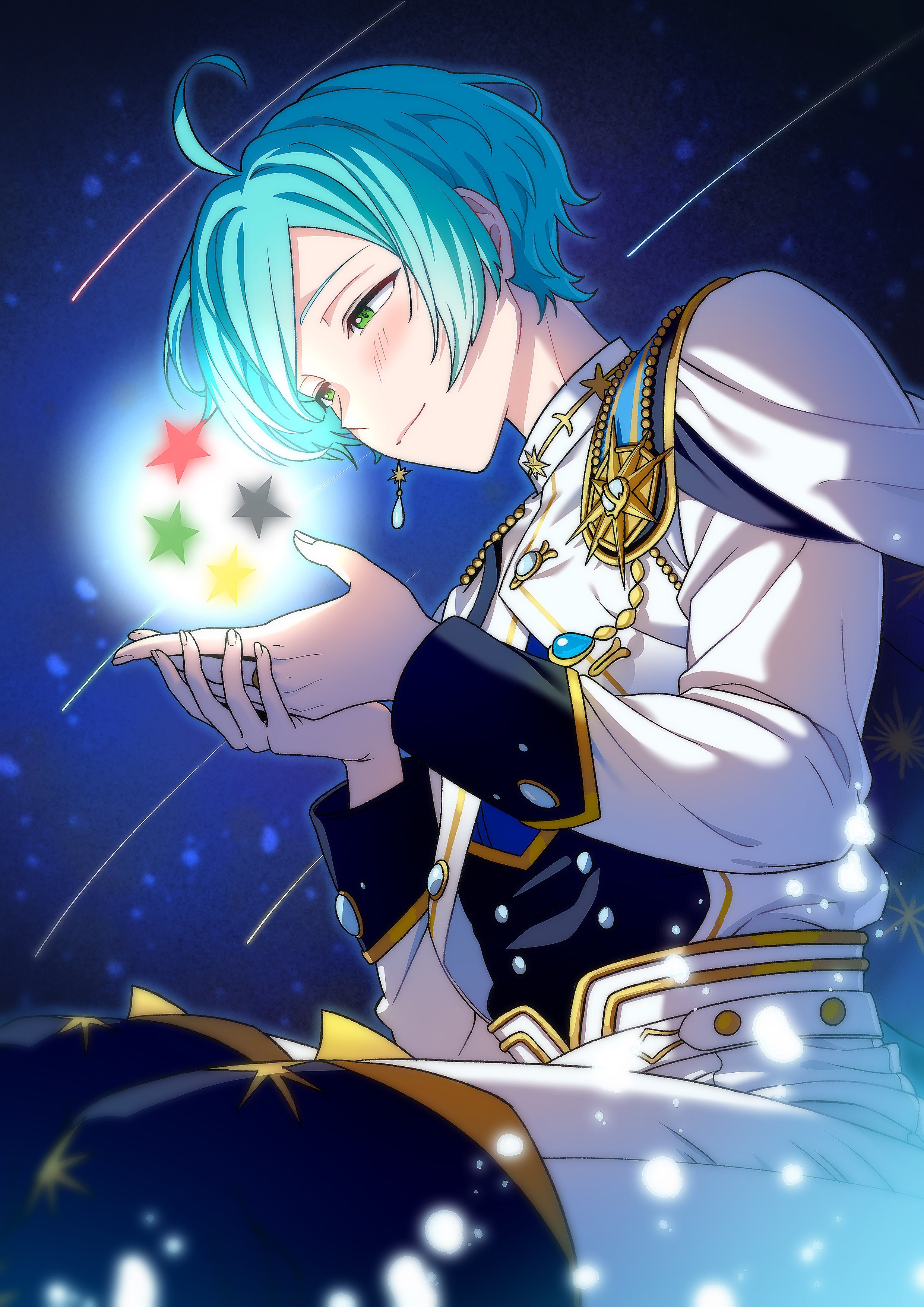 1boy absurdres ahoge baldstorm blue_boots blue_hair blush boots earrings ensemble_stars! green_eyes highres jacket jewelry long_sleeves looking_down male_focus pants shinkai_kanata shooting_star short_hair sitting solo star_(symbol) star_symbol_background white_jacket white_pants