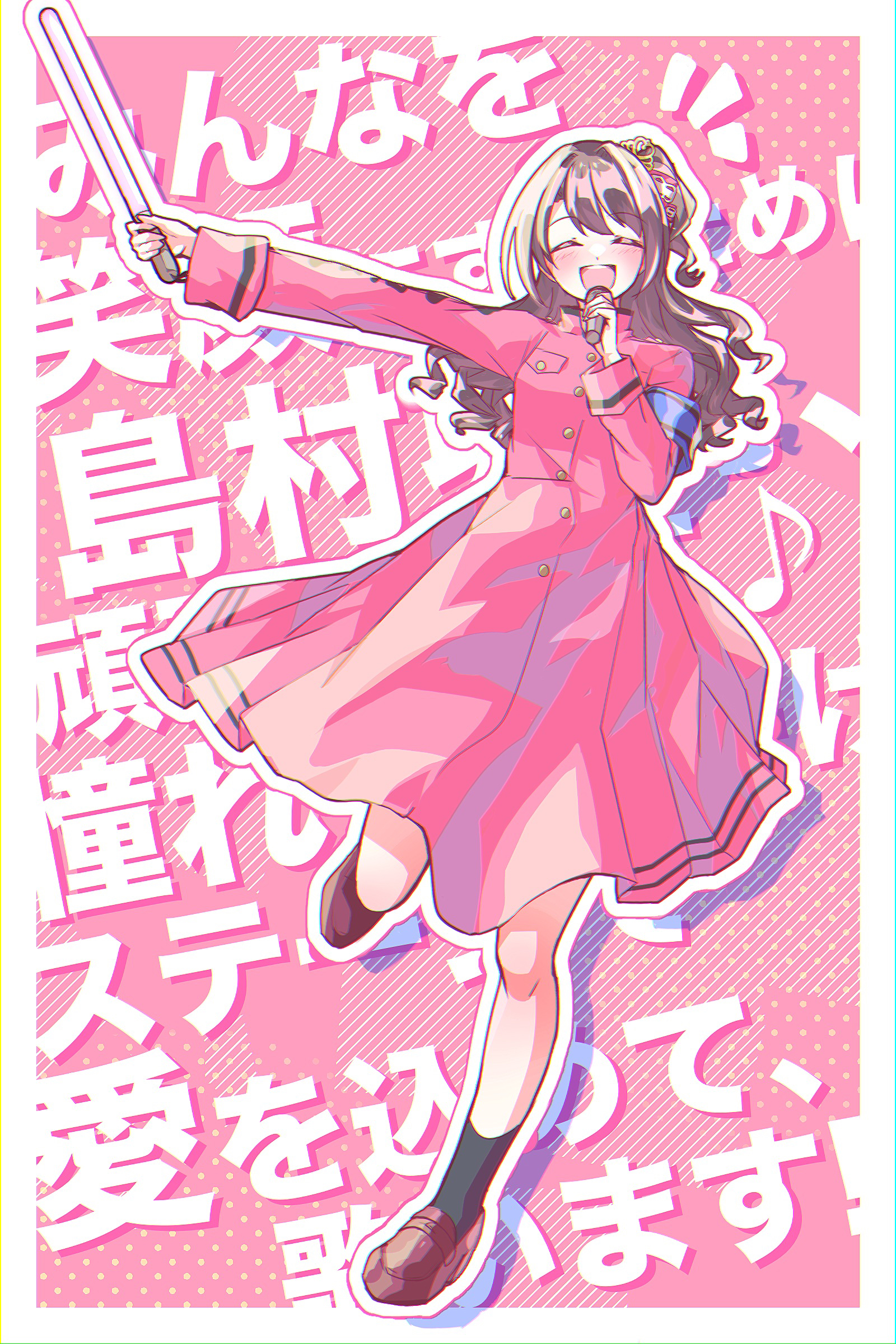 1girl absurdres blush brown_hair closed_eyes dress glowstick high_collar highres holding holding_glowstick holding_microphone idolmaster idolmaster_cinderella_girls koriyukika032 loafers long_hair long_sleeves microphone mini_tiara one_side_up open_mouth outline outstretched_arm pink_background pleated_dress shimamura_uzuki shoes smile socks solo standing standing_on_one_leg tiara translation_request very_long_hair white_outline