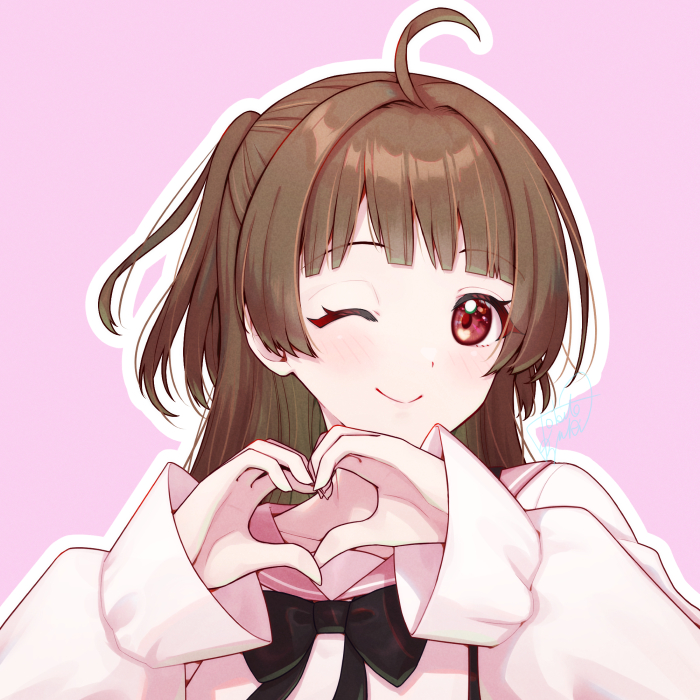 1girl ahoge blunt_bangs blush bow bowtie brown_hair commission heart heart_hands long_hair long_sleeves looking_at_viewer one_eye_closed original pink_background red_eyes sailor_collar smile solo tokifuji_kougetsu two_side_up upper_body