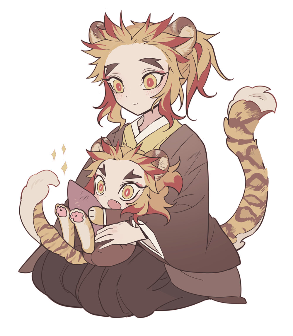 2boys :o aged_down animal_ears animal_feet animal_hands black_hakama blonde_hair brothers closed_mouth colored_tips commentary_request fang forked_eyebrows hakama haori japanese_clothes kemonomimi_mode kimetsu_no_yaiba kimono leopard_ears leopard_tail long_hair long_sleeves looking_at_another male_focus meremero multicolored_hair multiple_boys open_mouth red_hair rengoku_kyoujurou rengoku_shinjurou siblings simple_background sitting sitting_on_lap sitting_on_person smile streaked_hair tail white_background wide_sleeves yellow_eyes
