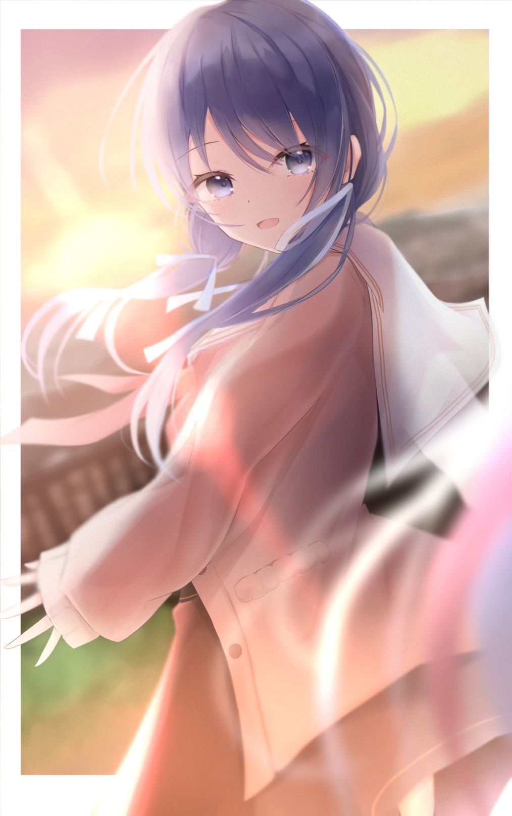 1girl blue_eyes blue_hair highres link!_like!_love_live! long_sleeves looking_at_viewer love_live! maddo_(gasser_0518) murano_sayaka open_mouth smile solo