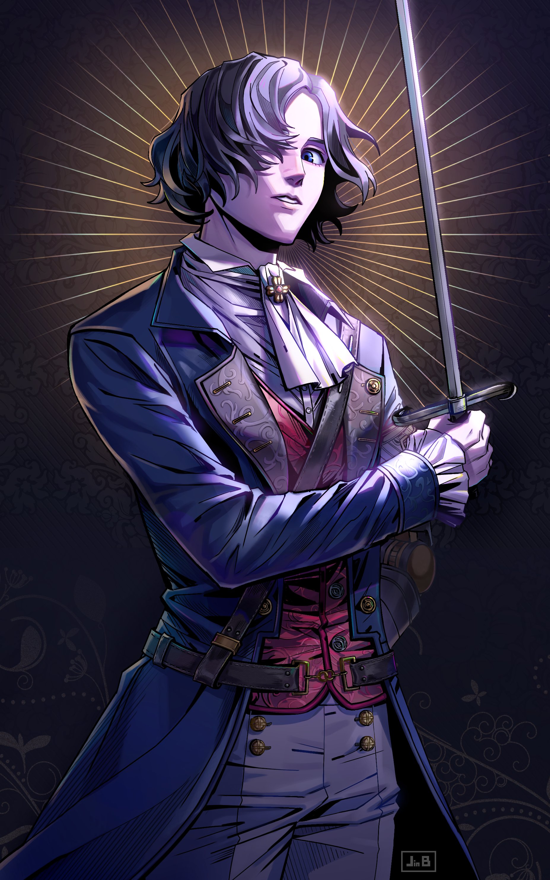 1boy absurdres arm_behind_back artist_logo artist_name ascot backlighting belt black_hair blue_coat blue_eyes brooch brown_belt coat collared_shirt commentary_request cowboy_shot frilled_sleeves frills gamjajb grey_pants hair_over_one_eye highres holding holding_sword holding_weapon jewelry korean_commentary lies_of_p logo long_sleeves looking_at_viewer male_focus mechanical_arms open_clothes open_coat pants parted_lips pinocchio_(lies_of_p) prosthesis prosthetic_arm red_vest shirt short_hair simple_background single_mechanical_arm solo standing sword vest weapon white_ascot white_shirt wing_collar