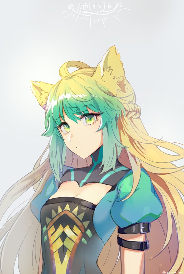 1girl ahoge animal_ears arm_belt atalanta_(fate) blonde_hair braid closed_mouth dress expressionless fate/apocrypha fate_(series) green_dress green_eyes green_hair looking_at_viewer puffy_short_sleeves puffy_sleeves short_sleeves simple_background solo upper_body white_background yuura