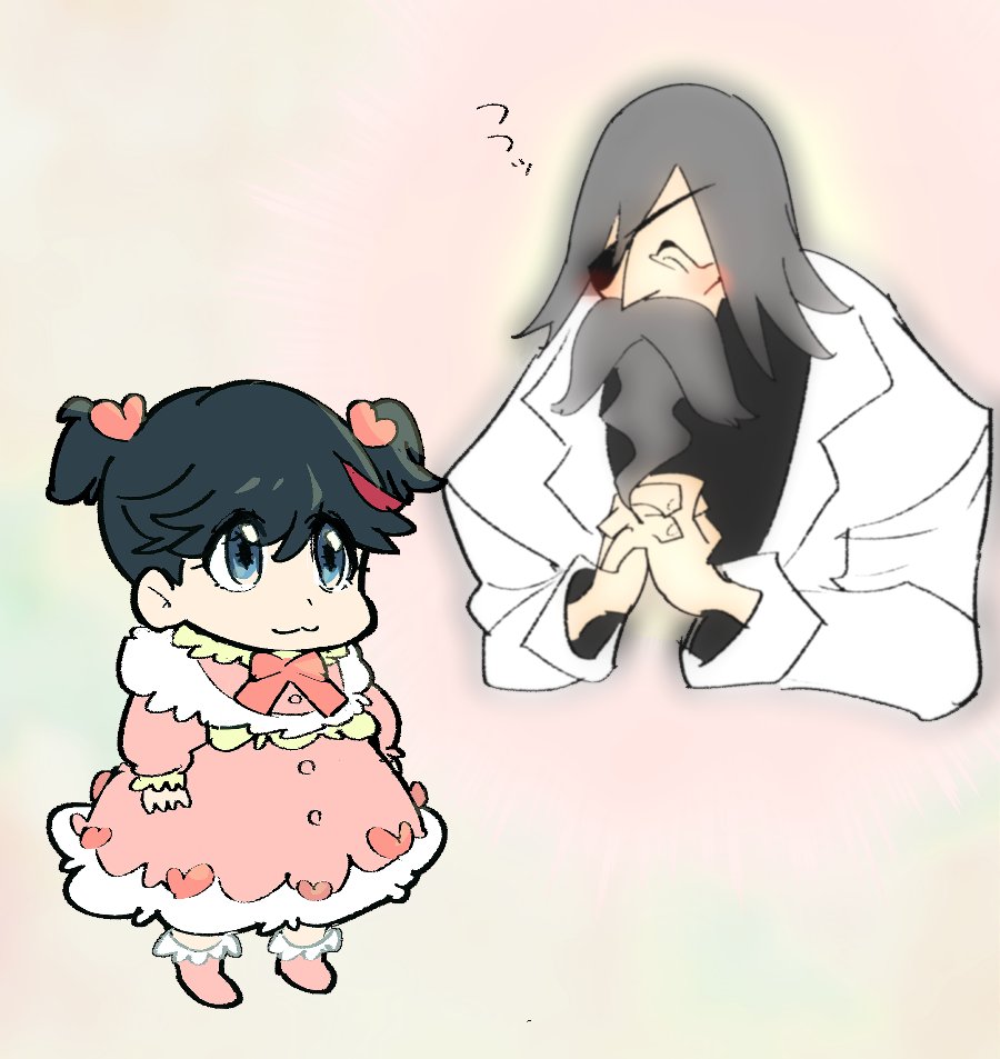 aged_down beard blush facial_hair father_and_child father_and_daughter gyosone kill_la_kill lab_coat matoi_isshin matoi_ryuuko multicolored_hair old old_man parent_and_child short_hair short_twintails toddler twintails two-tone_hair