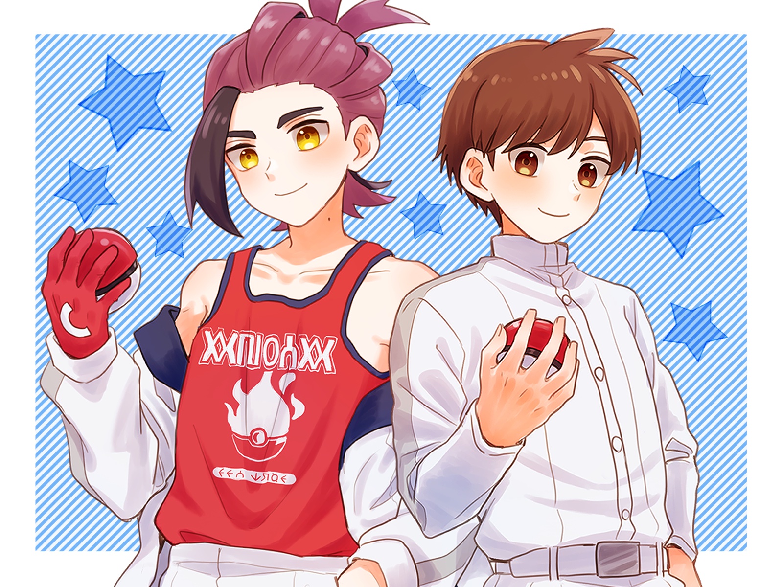 2boys belt black_hair brown_eyes brown_hair collarbone colored_inner_hair commentary_request cowboy_shot florian_(pokemon) gloves hair_tie hair_tied hair_tied_up high_collar highres holding holding_poke_ball jacket kieran_(pokemon) light_blush looking_at_viewer loose_hair_strand male_focus mochi_(mocchi_p_2m) mole mole_on_neck multicolored_hair multiple_boys nintendo off-shoulder_jacket off_shoulder one_glove poke_ball pokemon pokemon_scarlet_and_violet purple_hair red_gloves red_tank_top shirt short_hair shorts single_glove smile star_(symbol) star_symbol_background tank_top two-tone_hair upper_body white_background white_jacket white_shorts yellow_eyes
