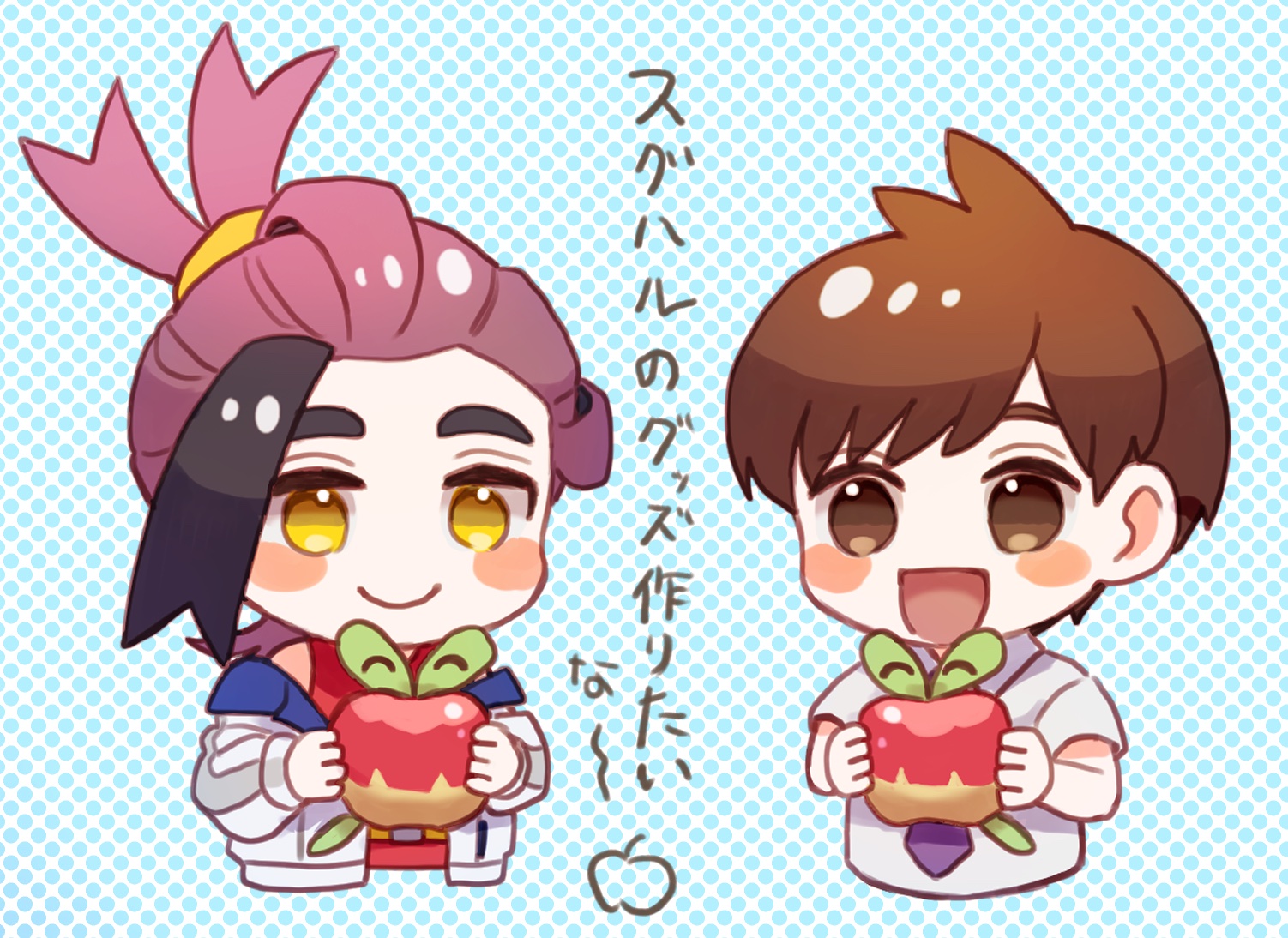 2boys applin black_hair blush blush_stickers brown_eyes brown_hair chibi closed_mouth collared_shirt colored_inner_hair commentary_request florian_(pokemon) gen_8_pokemon hair_tie hair_tied hair_tied_up happy heart holding holding_pokemon jacket kieran_(pokemon) loose_hair_strand male_focus mochi_(mocchi_p_2m) multicolored_hair multiple_boys necktie nintendo off-shoulder_jacket off_shoulder open_mouth pokemon pokemon_(creature) pokemon_scarlet_and_violet purple_hair red_tank_top shirt short_hair smile tank_top two-tone_hair upper_body white_jacket white_shirt yellow_eyes