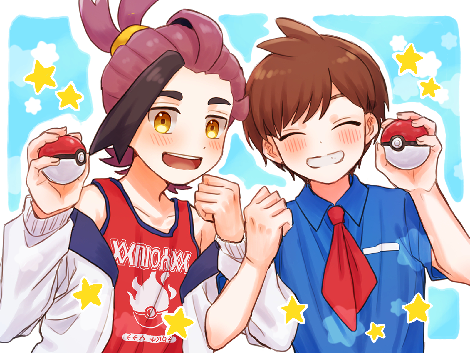 2boys arms_locked black_hair blue_shirt blush brown_hair clenched_hand closed_eyes collared_shirt colored_inner_hair commentary_request facing_viewer florian_(pokemon) gen_8_pokemon hair_tie hair_tied hair_tied_up hand_up happy highres holding holding_poke_ball jacket kieran_(pokemon) looking_at_viewer loose_hair_strand male_focus mochi_(mocchi_p_2m) multicolored_hair multiple_boys necktie nintendo off-shoulder_jacket off_shoulder open_mouth poke_ball pokemon pokemon_scarlet_and_violet purple_hair red_tank_top shirt short_hair smile star_(symbol) tank_top teeth two-tone_hair upper_body upper_teeth_only white_jacket yellow_eyes