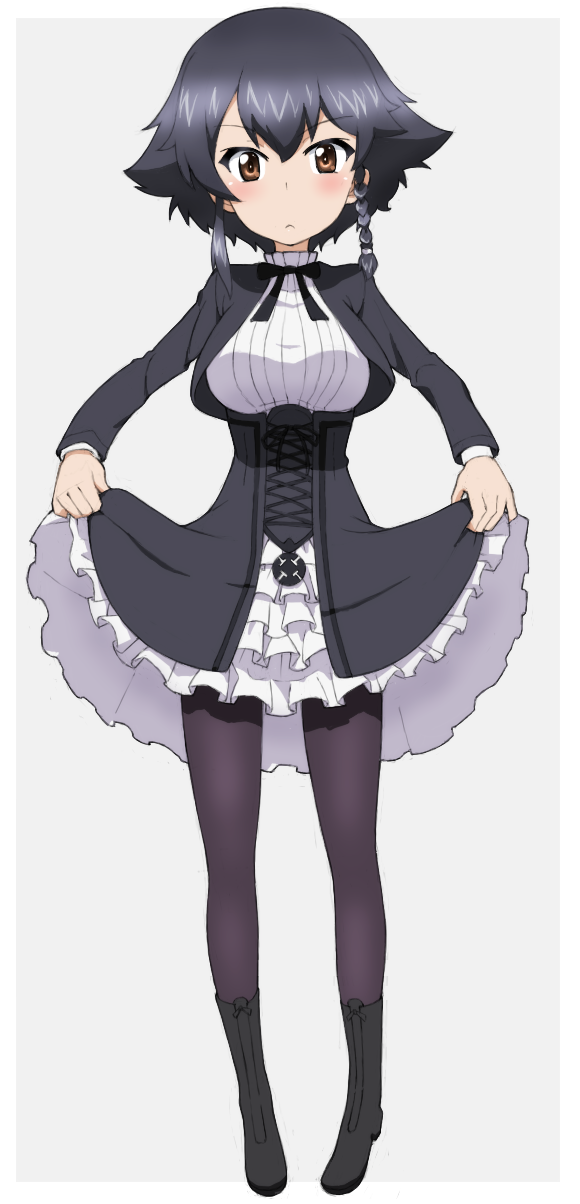 1girl alternate_costume black_boots black_dress black_hair black_pantyhose blush boots braid breasts brown_eyes closed_mouth commentary cosplay dorothy_(princess_principal) dorothy_(princess_principal)_(cosplay) dress frilled_dress frills frown full_body girls_und_panzer grey_background hair_tie highres holding_own_dress kayabakoro large_breasts long_sleeves looking_at_viewer medium_dress pantyhose pepperoni_(girls_und_panzer) princess_principal short_hair side_braid solo standing taichi_you voice_actor_connection