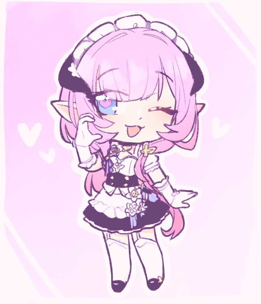 1girl ;d apron black_dress black_shoes blue_eyes chibi commentary_request dress elysia_(honkai_impact) elysia_(miss_pink_elf)_(honkai_impact) frilled_apron frills full_body garter_straps gloves hand_up heart heart-shaped_pupils honkai_(series) honkai_impact_3rd horns long_hair looking_at_viewer maid_headdress one_eye_closed open_mouth pink_background pink_hair pointy_ears puffy_short_sleeves puffy_sleeves robin_cordelia shoes short_sleeves smile solo symbol-shaped_pupils thighhighs very_long_hair white_apron white_gloves white_thighhighs
