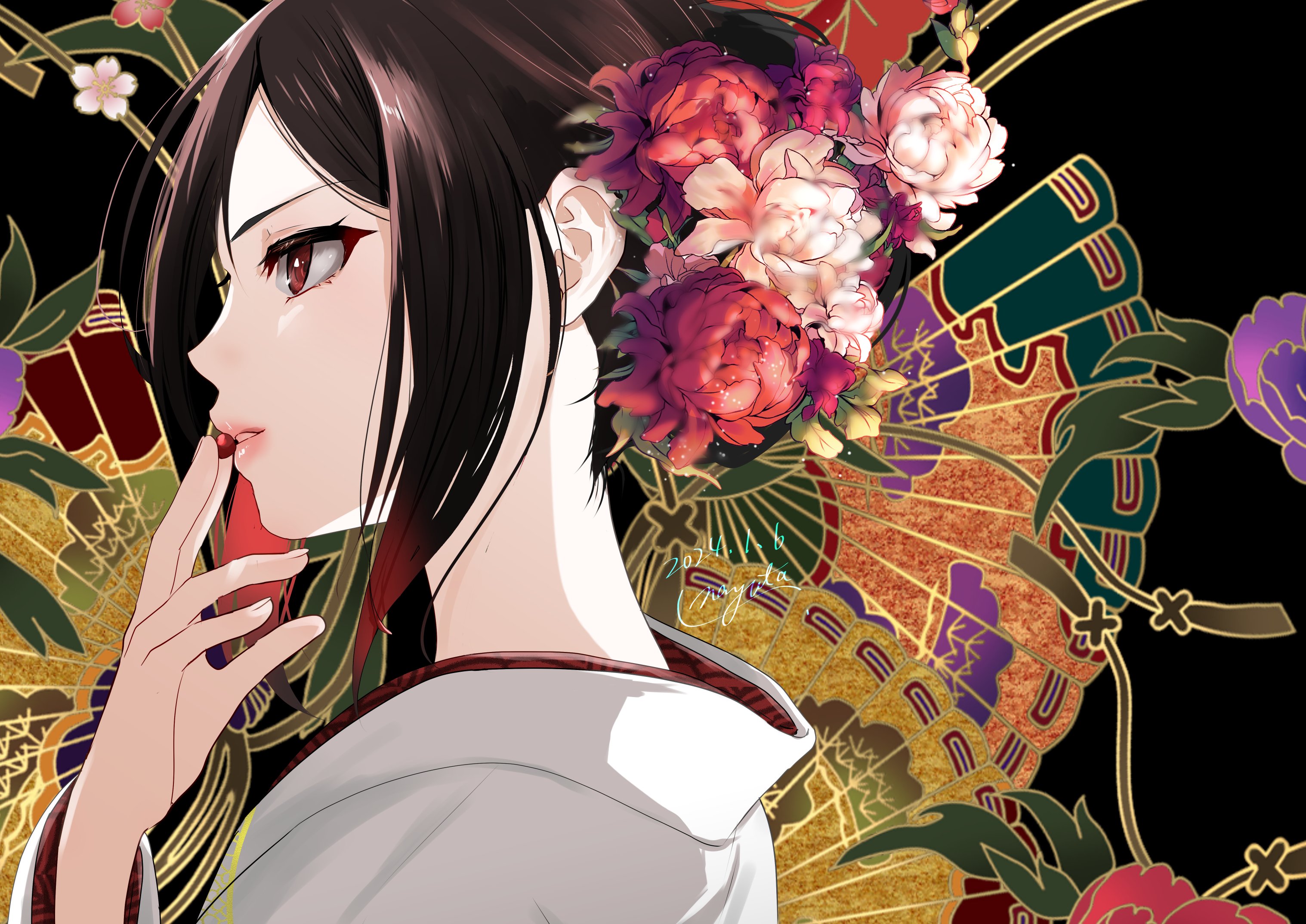 1girl black_background black_hair commentary_request flower folding_fan from_side gradient_hair hair_flower hair_ornament hand_fan hand_up highres japanese_clothes kimono long_sleeves morag_ladair_(xenoblade) multicolored_hair nayuta-kanata profile red_eyes red_flower red_hair sidelocks simple_background solo upper_body white_flower white_kimono wide_sleeves xenoblade_chronicles_(series) xenoblade_chronicles_2