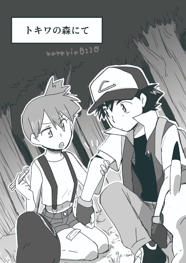 1boy 1girl ash_ketchum asymmetrical_hair bare_shoulders baseball_cap black_hair breasts denim denim_shorts gen_1_pokemon gloves gym_leader hair_between_eyes hair_bun hair_tie hat kanarin0220 misty_(pokemon) monochrome nintendo orange_hair pokemon pokemon_(anime) pokemon_(classic_anime) ponytail shiny_skin shirt short_hair short_shorts shorts side_ponytail small_breasts suspenders tank_top yellow_shirt yellow_tank_top