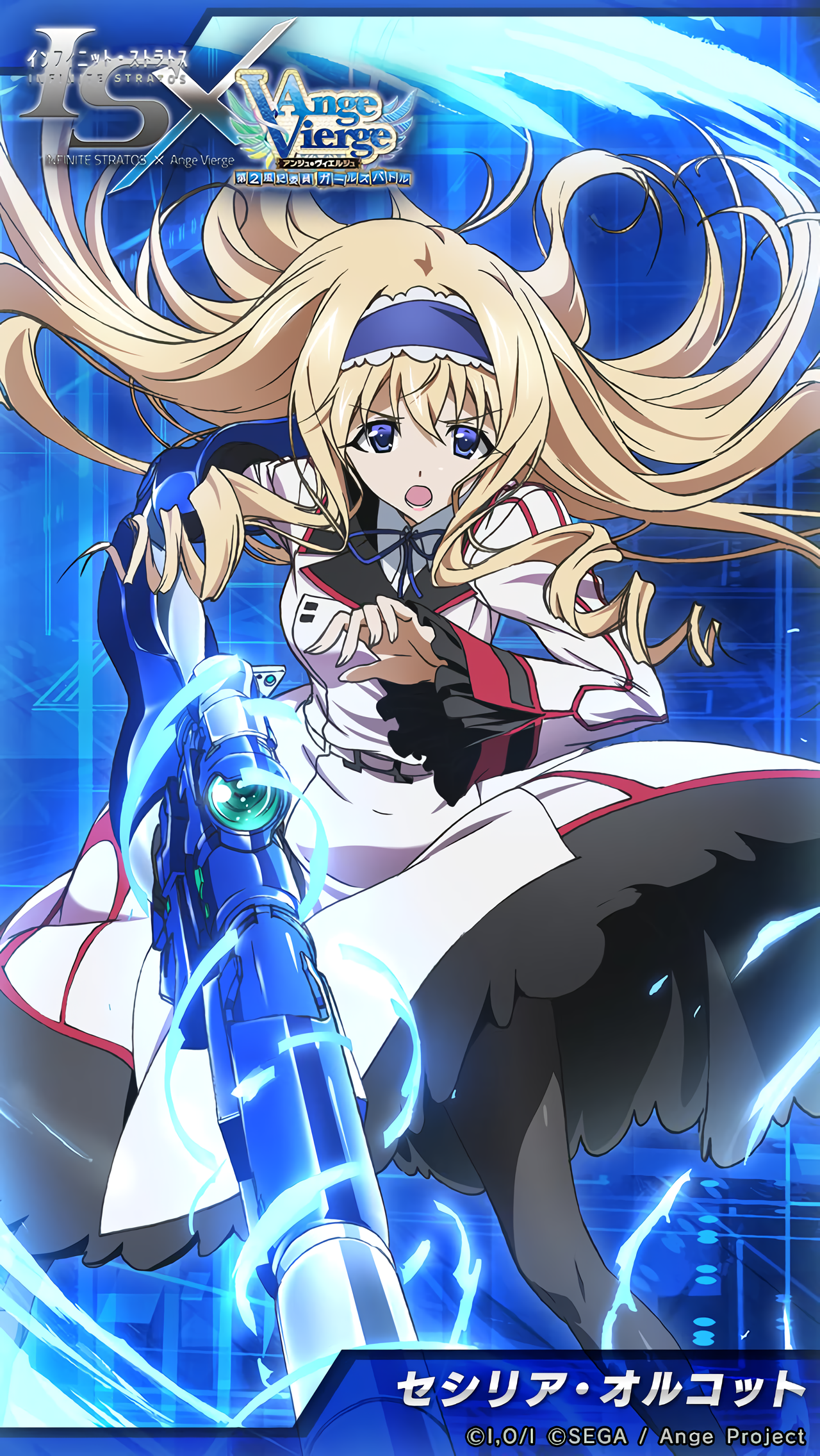 1girl ange_vierge blonde_hair blue_eyes blush bow breasts cecilia_alcott crossover drill_hair gun hair_bow highres incoming_attack infinite_stratos large_breasts legs long_hair looking_at_viewer official_art pantyhose serious solo thighs weapon