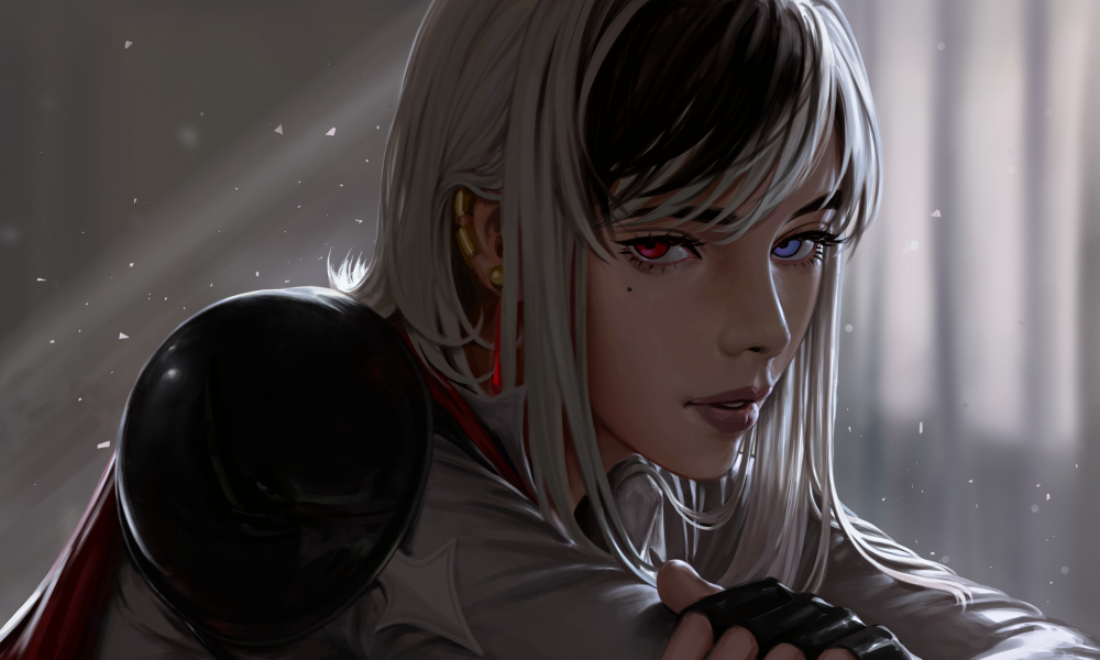 1girl black_gloves black_hair blue_eyes close-up earrings gloves heterochromia hollizho jewelry light medium_hair mole mole_under_eye multicolored_hair original parted_lips red_eyes red_scarf scarf single_earring solo stud_earrings two-tone_hair white_hair