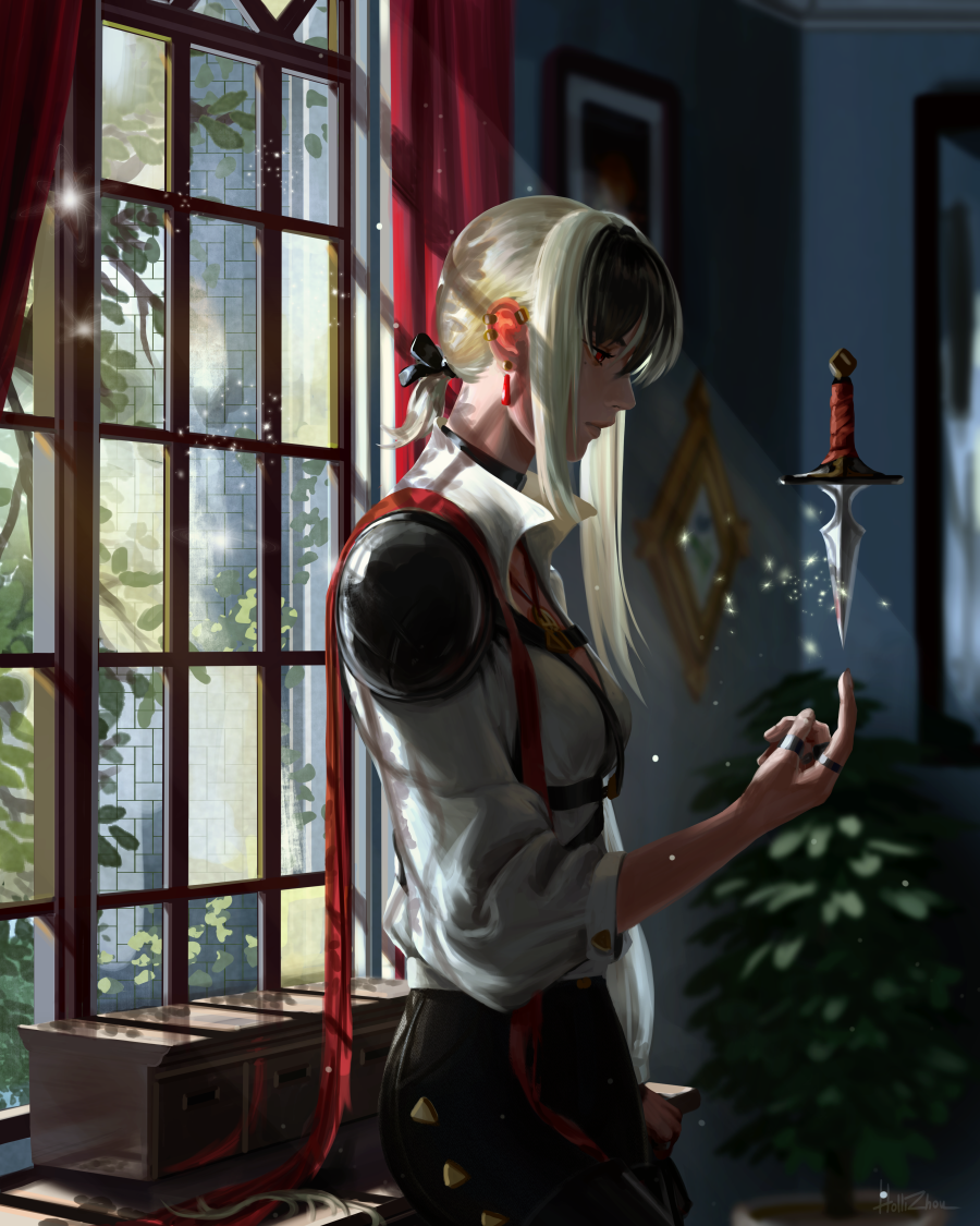 black_hair blonde_hair cowboy_shot dagger earrings floating floating_object floating_weapon from_side hollizho jewelry knife light magic mole mole_under_eye original ponytail red_eyes red_scarf scarf shirt single_earring stud_earrings weapon white_shirt