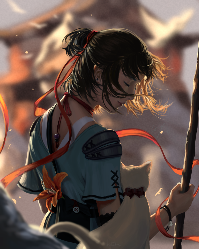 bag bird cat earrings flower holding holding_staff hollizho jewelry original ribbon scar staff stud_earrings white_cat wind witch