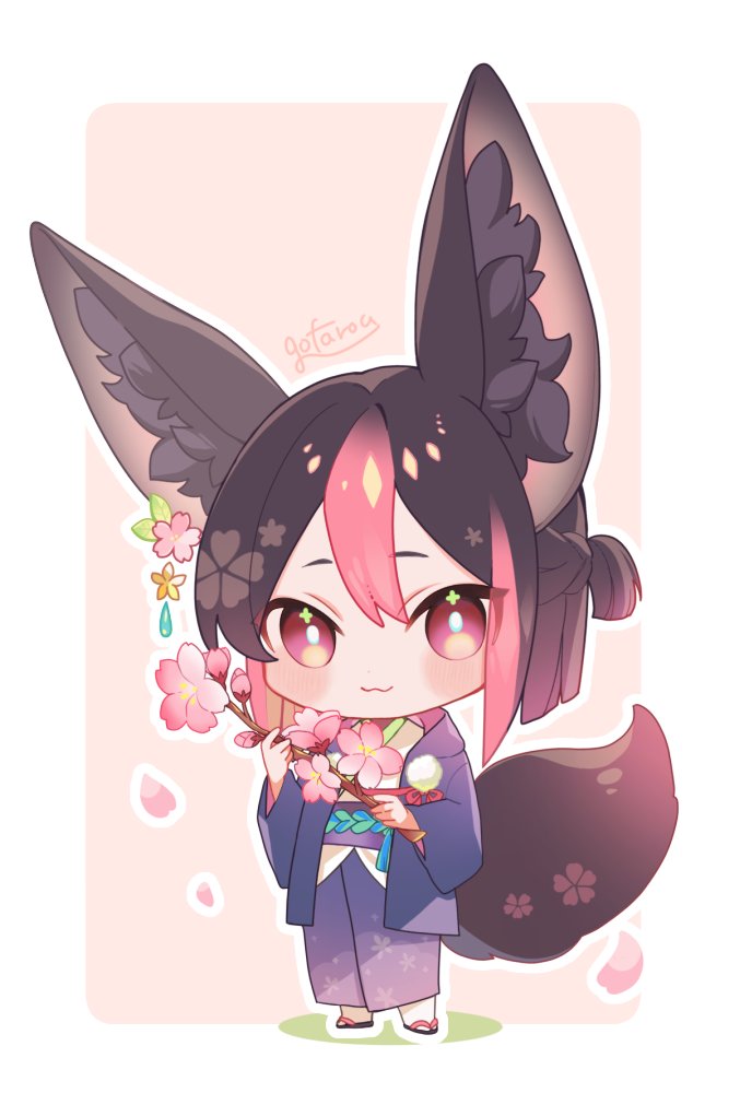 1boy alternate_hair_color animal_ear_fluff animal_ears black_hair cherry_blossoms chibi closed_mouth earrings fox_boy fox_ears genshin_impact green_eyes hair_between_eyes japanese_clothes jewelry kimono long_sleeves looking_at_viewer male_focus multicolored_hair pink_hair rin_gotarou short_hair smile solo streaked_hair tighnari_(genshin_impact)