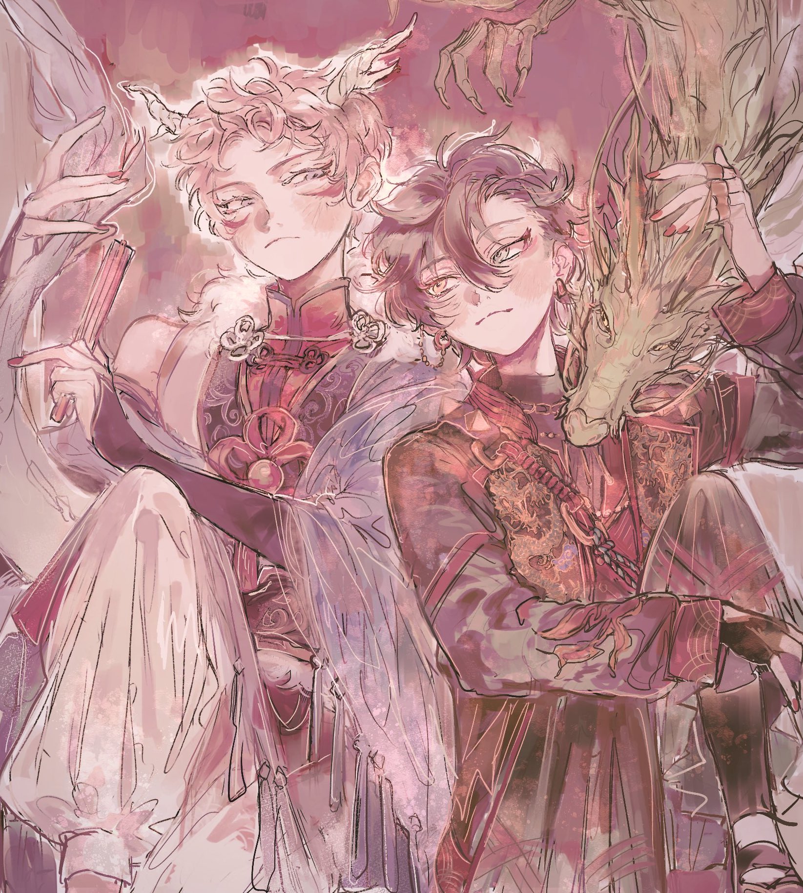 2boys black_hair blue_eyes chinese_zodiac dragon dragon_boy dragon_horns dragon_tail ensemble_stars! facing_viewer heterochromia highres horns itsuki_shu japanese_clothes kagehira_mika looking_at_another multiple_boys official_alternate_costume ougonten_(ensemble_stars!) pink_hair purple_eyes rokublue short_bangs short_hair tail valkyrie_(ensemble_stars!) year_of_the_dragon yellow_eyes