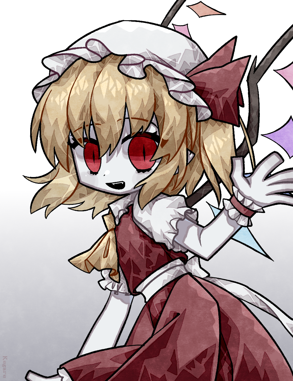 1257mythos_(1257kagome) 1girl ascot back_bow blonde_hair bow cowboy_shot flandre_scarlet frilled_shirt_collar frilled_skirt frilled_sleeves frills from_side gradient_background hair_between_eyes hat highres looking_at_viewer looking_to_the_side medium_hair mob_cap multicolored_wings puffy_short_sleeves puffy_sleeves red_eyes red_skirt red_vest shirt short_sleeves simple_background skirt skirt_set solo touhou vest white_background white_bow white_hat white_shirt wings yellow_ascot