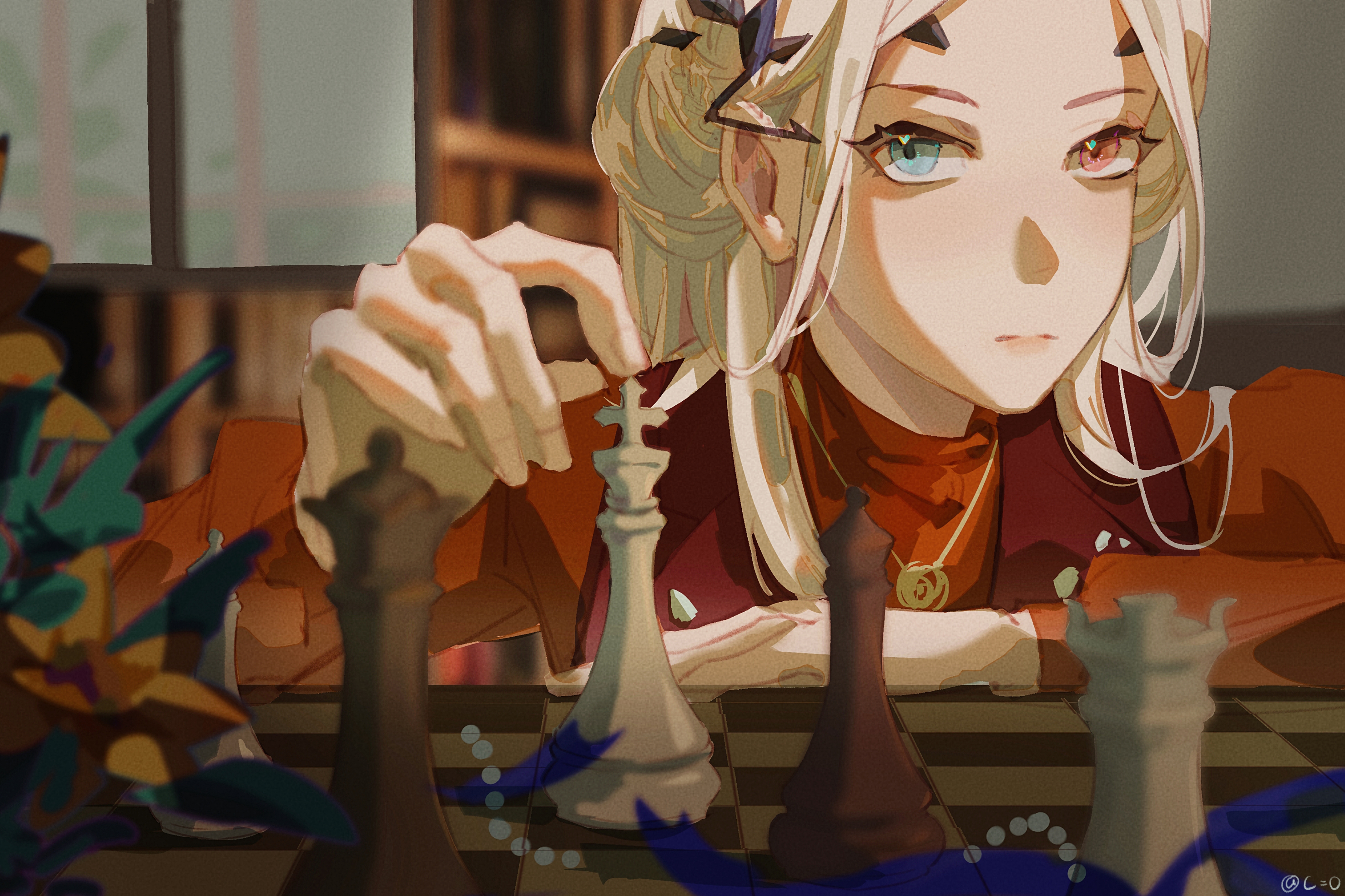 1girl absurdres aged_down aqua_eyes artist_name bishop_(chess) blonde_hair blurry blurry_background board_game bookshelf c=o chess chess_piece chessboard close-up eirene_(daughter_of_fraser_city)_(path_to_nowhere) eirene_(path_to_nowhere) flower gold_necklace hair_ornament half_updo heterochromia highres indoors jacket jewelry king_(chess) light_blush lips long_hair looking_at_viewer making-of_available necklace official_alternate_costume parted_bangs path_to_nowhere playing_chess queen_(chess) red_eyes red_jacket red_shirt rook_(chess) shirt solo upper_body window