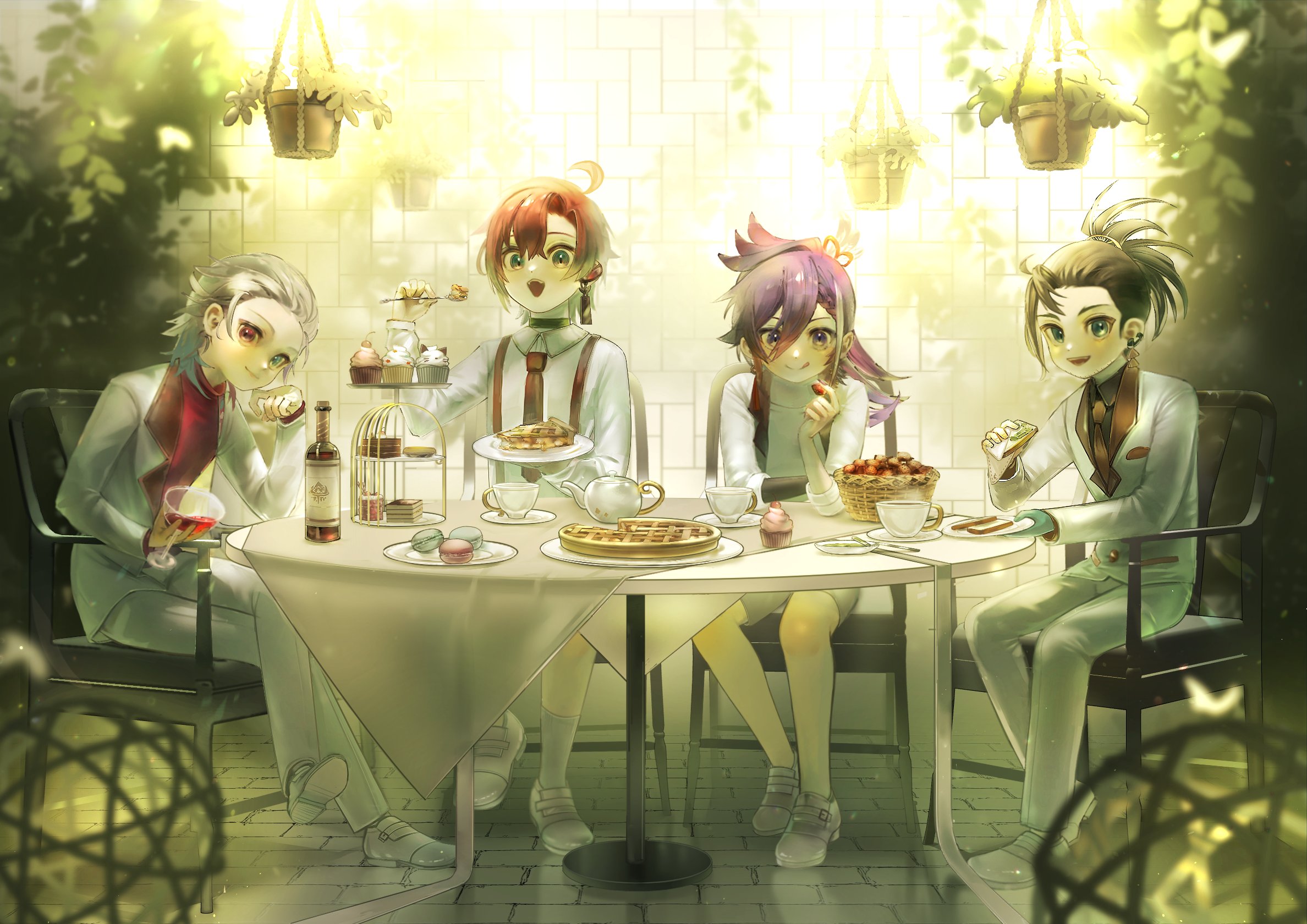 4boys aged_down ahoge alcohol alternate_costume alternate_hairstyle amain_dudu banzoin_hakka black_hair blue_eyes blue_hair blush bottle chair child choker commentary cup cupcake drinking_glass earrings english_commentary food formal_clothes full_body gavis_bettel grey_hair hanging_plant heterochromia high_ponytail highres holostars holostars_english holotempus imminent_bite jewelry josuiji_shinri long_hair looking_at_viewer macaron machina_x_flayon male_focus multicolored_hair multiple_boys multiple_earrings necktie on_chair outdoors pants pie pink_eyes pink_hair pink_shirt ponytail purple_hair red_hair red_necktie shirt short_hair shorts sitting smile steam suit suspenders table tassel tassel_earrings teacup teapot valentine virtual_youtuber white_footwear white_pants white_shirt white_shorts white_suit wine_bottle wine_glass