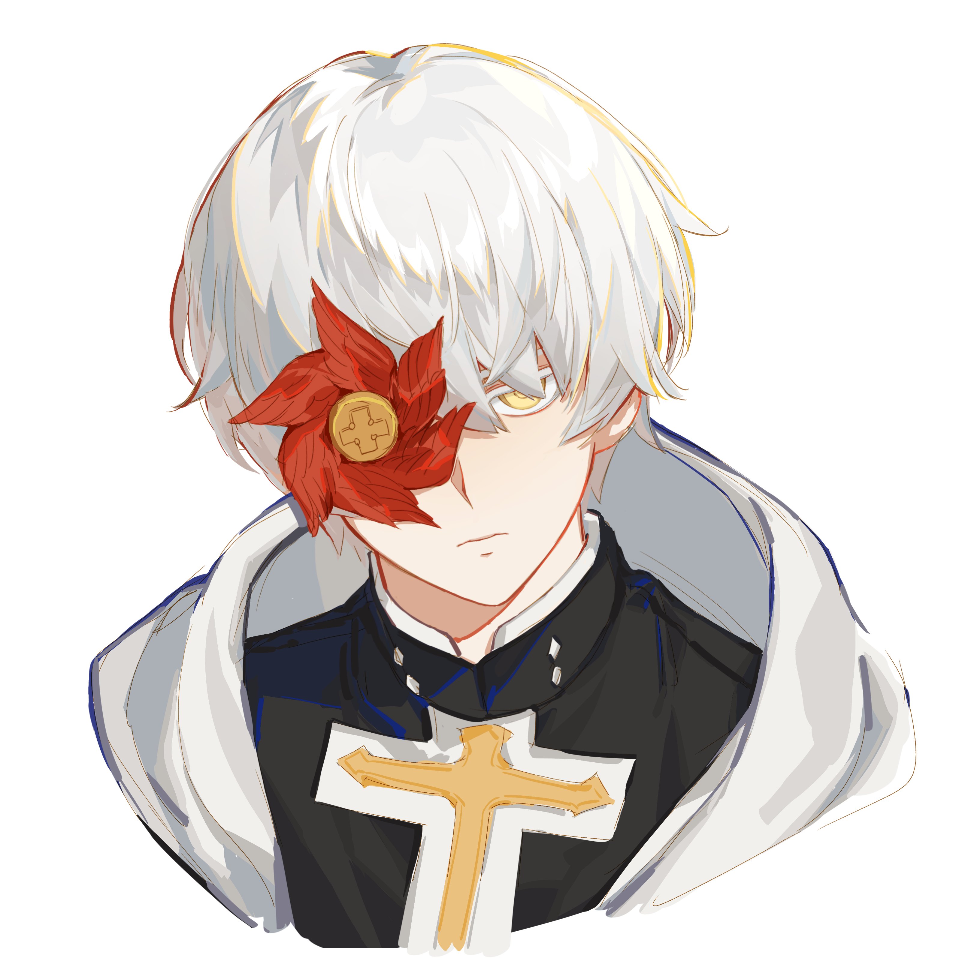 13327752wer 1boy absurdres asuka_r._kreutz closed_mouth spiked_halo cross eyepatch guilty_gear guilty_gear_strive hair_between_eyes halo highres latin_cross looking_at_viewer male_focus one_eye_covered short_hair simple_background upper_body white_hair yellow_eyes